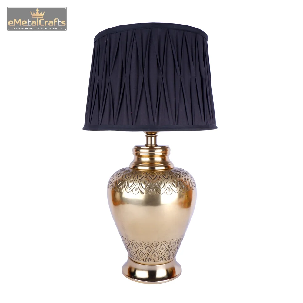 Bring elegance and grandeur into your home with this Vintage Gold Finish Table Lamp, designed to be a statement piece. The intricately embossed gold-tone base exudes luxury, while the bold black pleated fabric shade adds a modern contrast—creating a timeless blend of classic and contemporary style. Perfect for upscale interiors, this lamp enhances the ambiance of living rooms, bedrooms, offices, or entryways with its warm, ambient lighting.