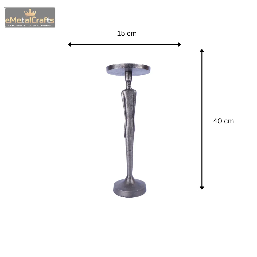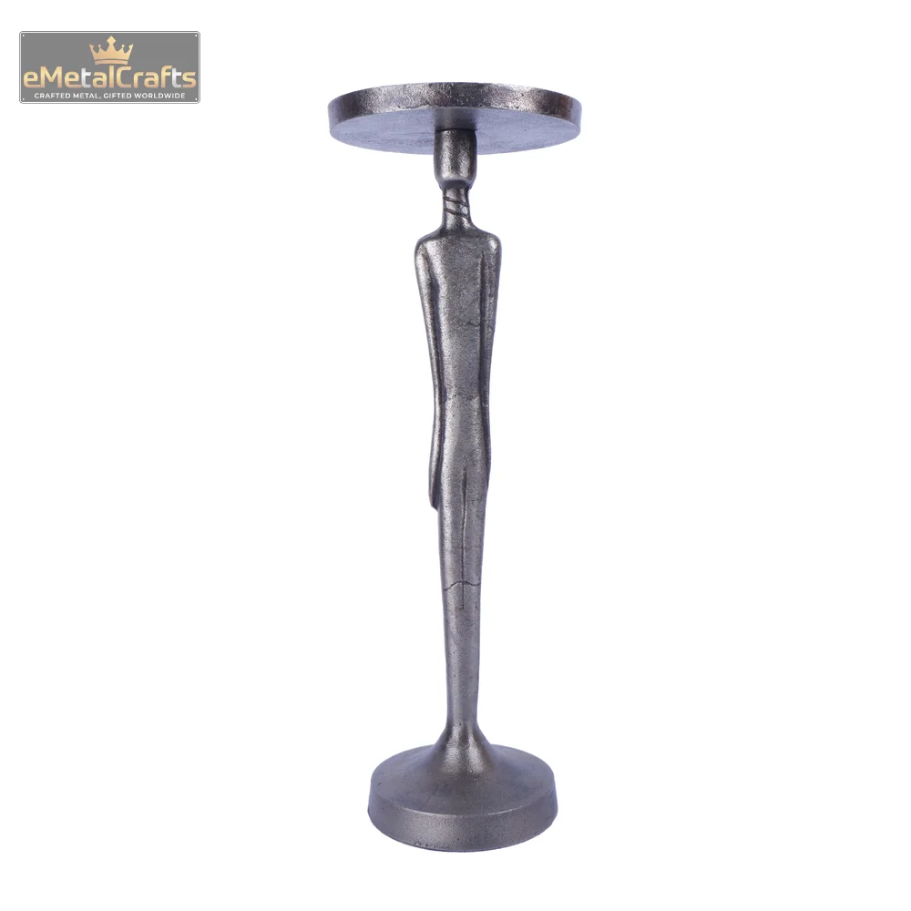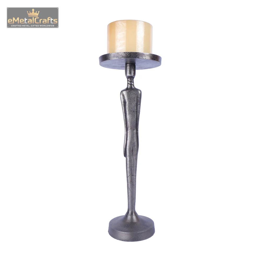 A sleek silver metal candle stand shaped like a stylized human figure, blending modern art with functionality—perfect for desks, shelves, or study spaces.