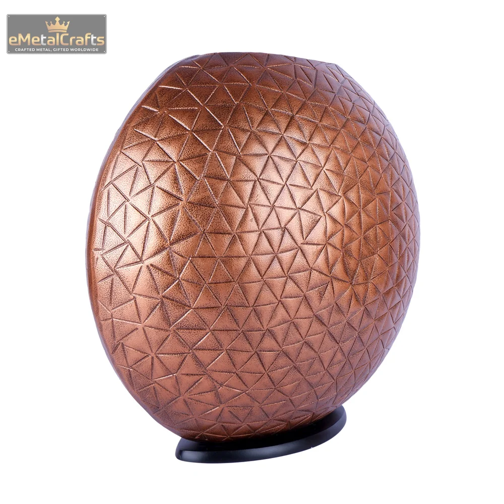 This eye-catching spherical vase boasts a rich, warm copper-toned finish, creating a luxurious and inviting presence. Aluminium Flower Pot its most striking feature is the intricate geometric pattern that completely covers its surface. This textured design, resembling faceted triangles or a quilted effect, creates dynamic shadows and highlights, giving the vase a multidimensional and contemporary appeal. The vase rests on a sleek, discreet black circular base, which provides stability and a modern contrast to the metallic body. Perfect as a standalone sculptural object, or for holding dried botanicals, pampas grass, or artificial arrangements.