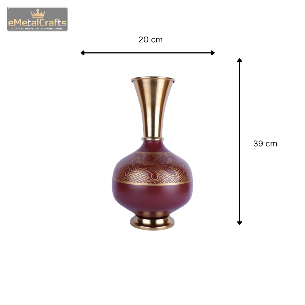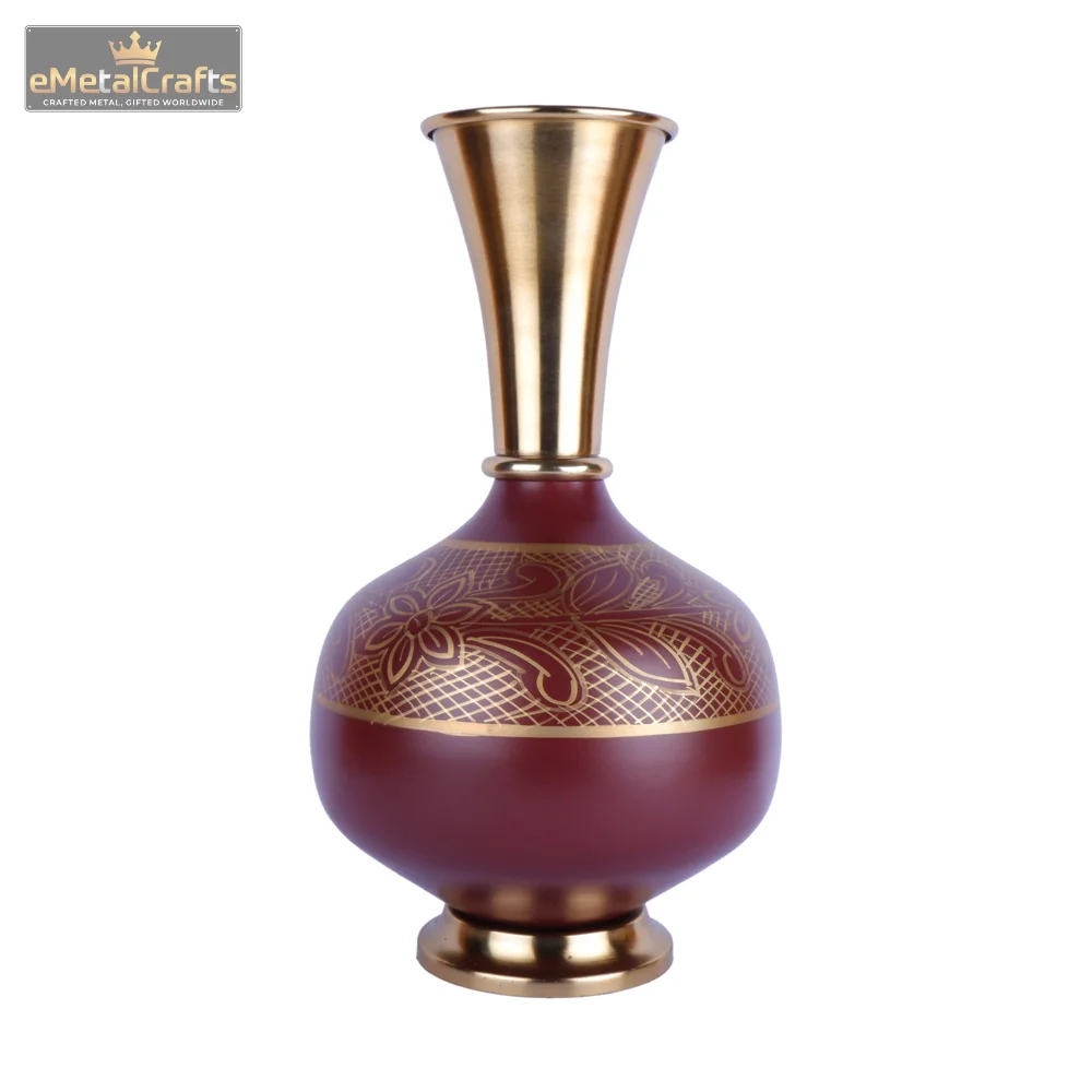 This elegant decorative vase features a rich maroon or deep red body, beautifully contrasted with a radiant golden neck and brown vases. The central, bulbous portion of the vase is adorned with intricate golden floral or vine-like patterns, adding a touch of traditional artistry and luxury. Its classic shape, with a flaring golden neck and a stable golden foot, exudes a sophisticated and timeless allure, making it an ideal centerpiece for dining tables, console tables, or a distinguished accent in any living space.