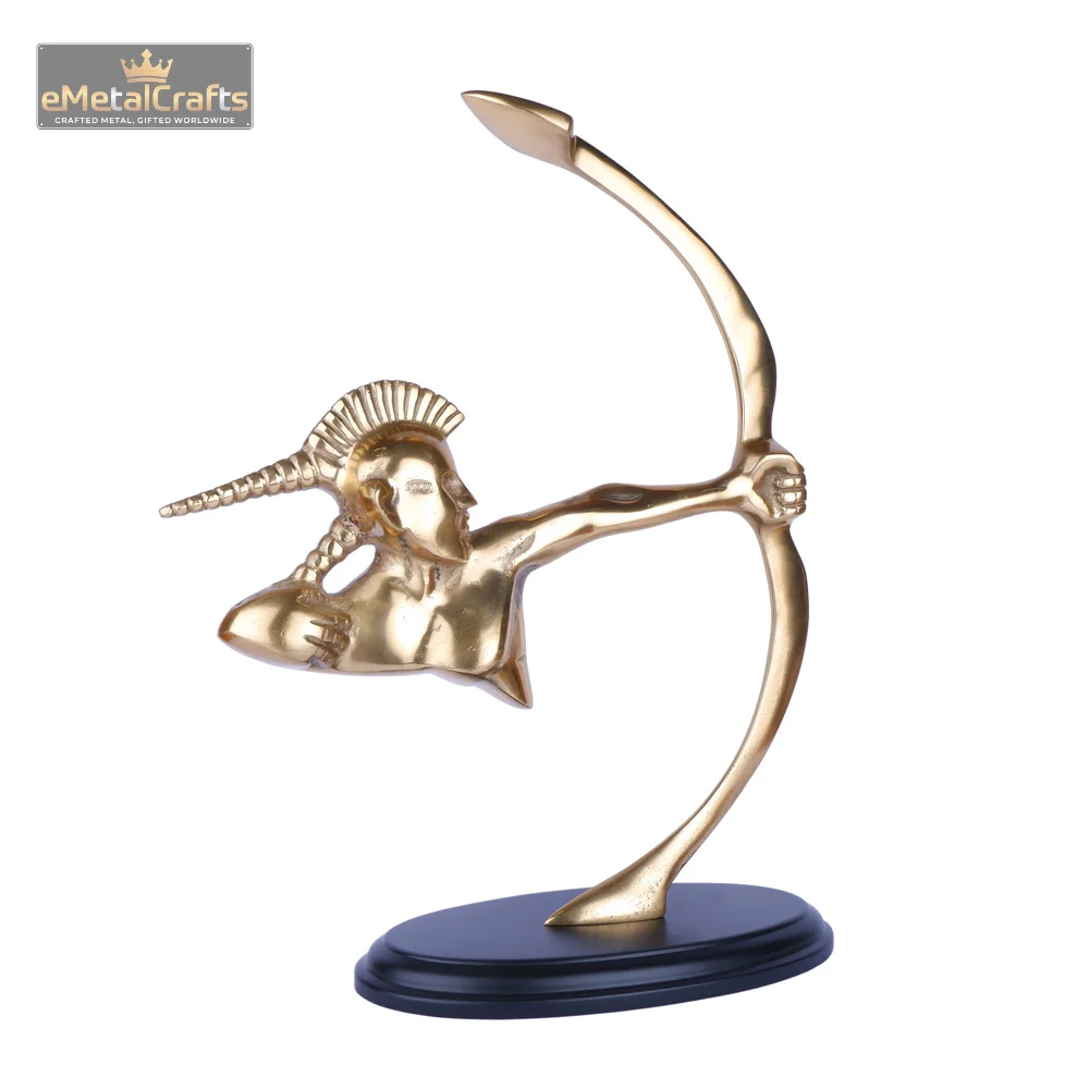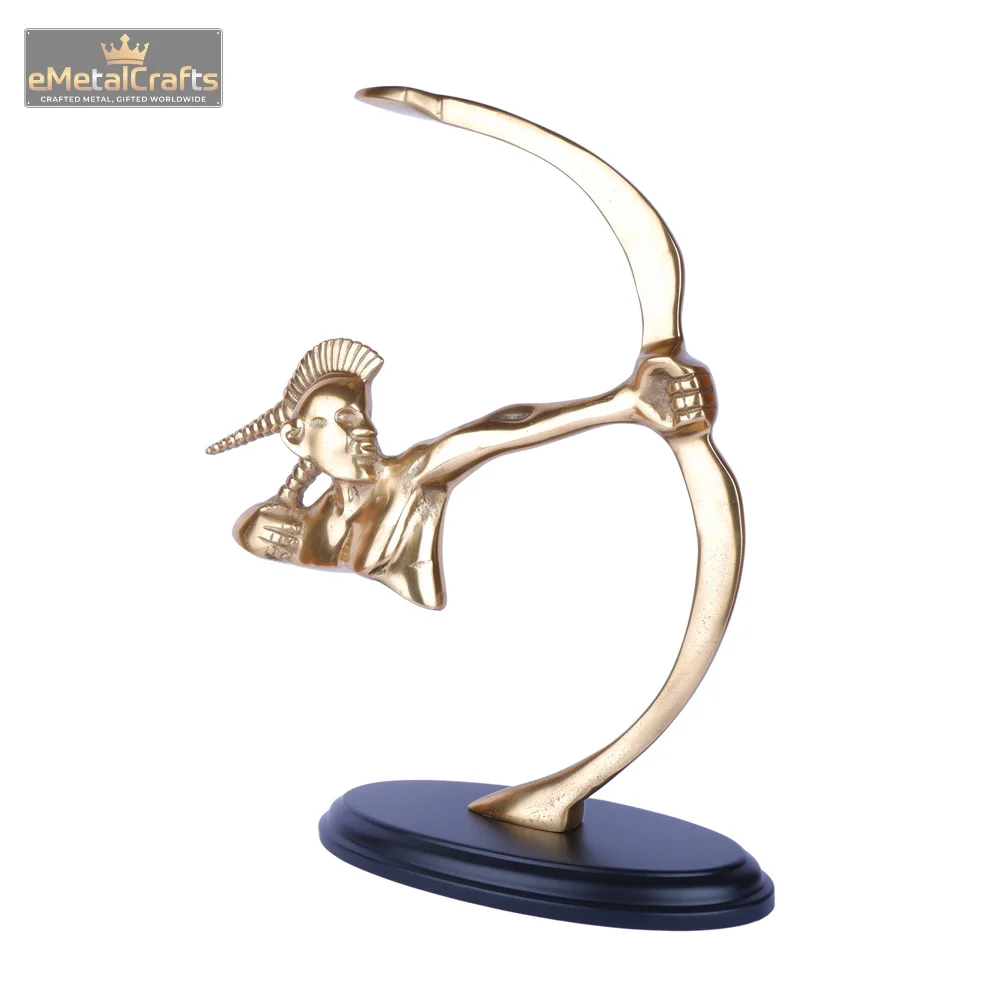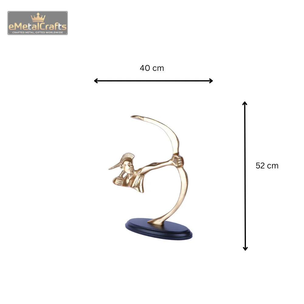 This commanding decorative piece features a dynamically posed archer sculptures for home décor, cast in a brilliant, lustrous golden finish. The figure is depicted mid-draw, with a distinctive, stylized feathered or horned headdress and an intense, focused expression, embodying strength, precision, and a mythical allure. The entire golden figure is securely mounted on a sturdy, matte black round base, which provides a striking contrast and ensures perfect stability.Perfect as a bold statement piece on a bookshelf, executive desk, mantelpiece, or console table, this sculpture is ideal for those who appreciate art, mythology, or unique decor that sparks conversation.
