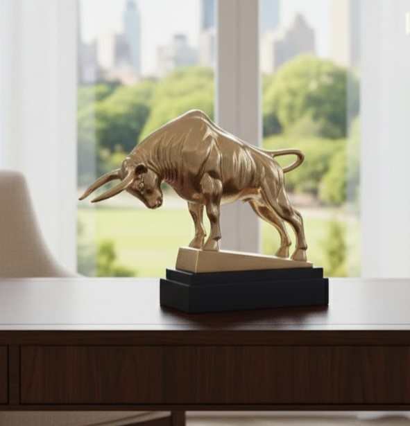 A striking gold-finished aluminium modern bull sculpture on a black wooden base, symbolizing strength and financial growth—perfect for offices, workspaces, or gifting to entrepreneurs.