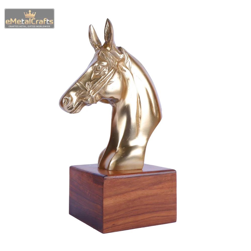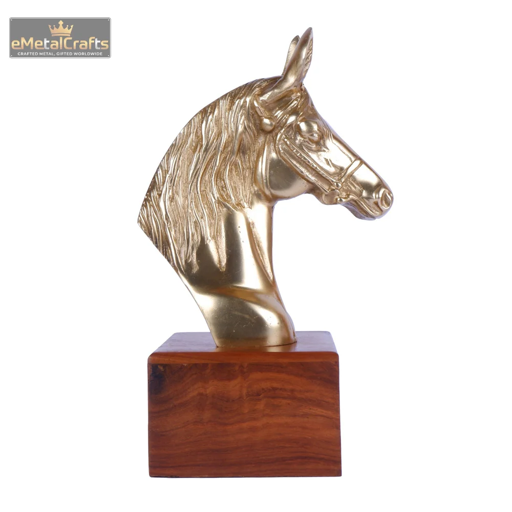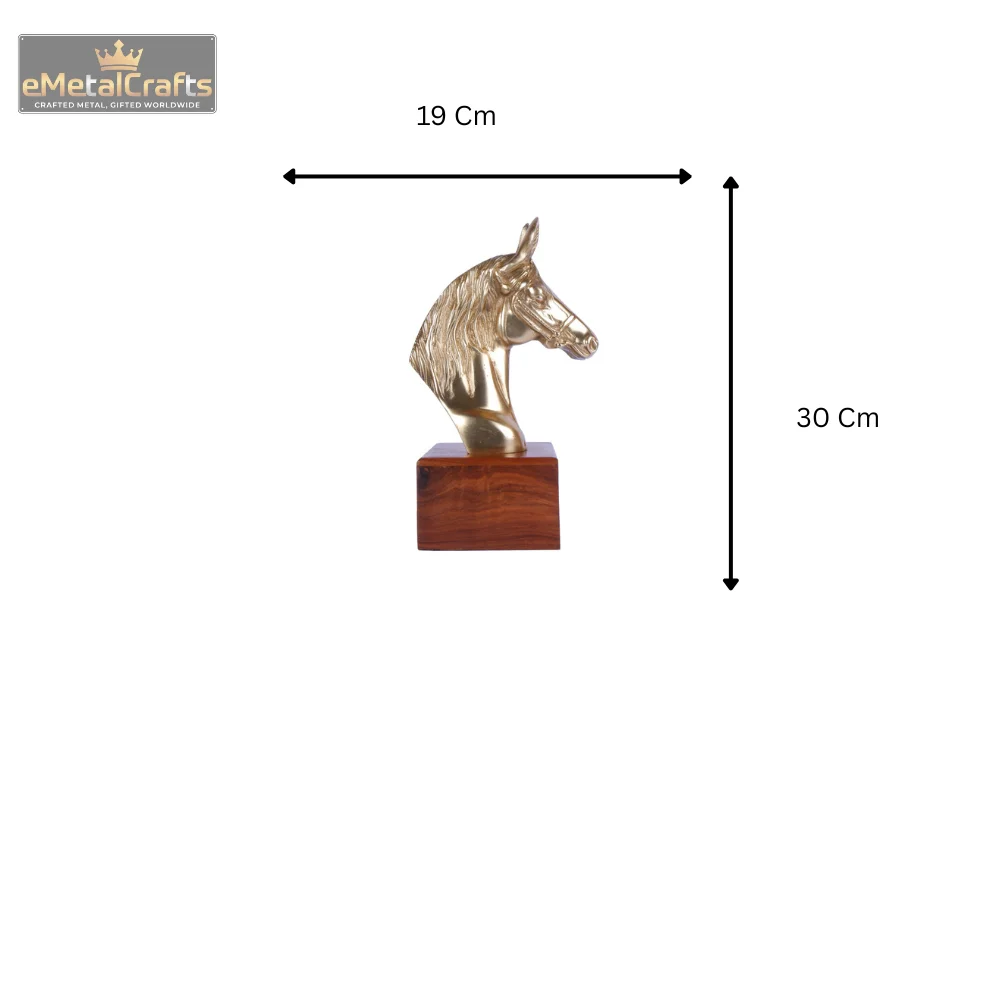 This elegant decorative piece features a detailed gold-colored metal horse face statue, mounted on a sturdy wooden base. The intricate design and craftsmanship add a sophisticated and rustic touch, making it an ideal accent for office desks, bookshelves, or study corners.