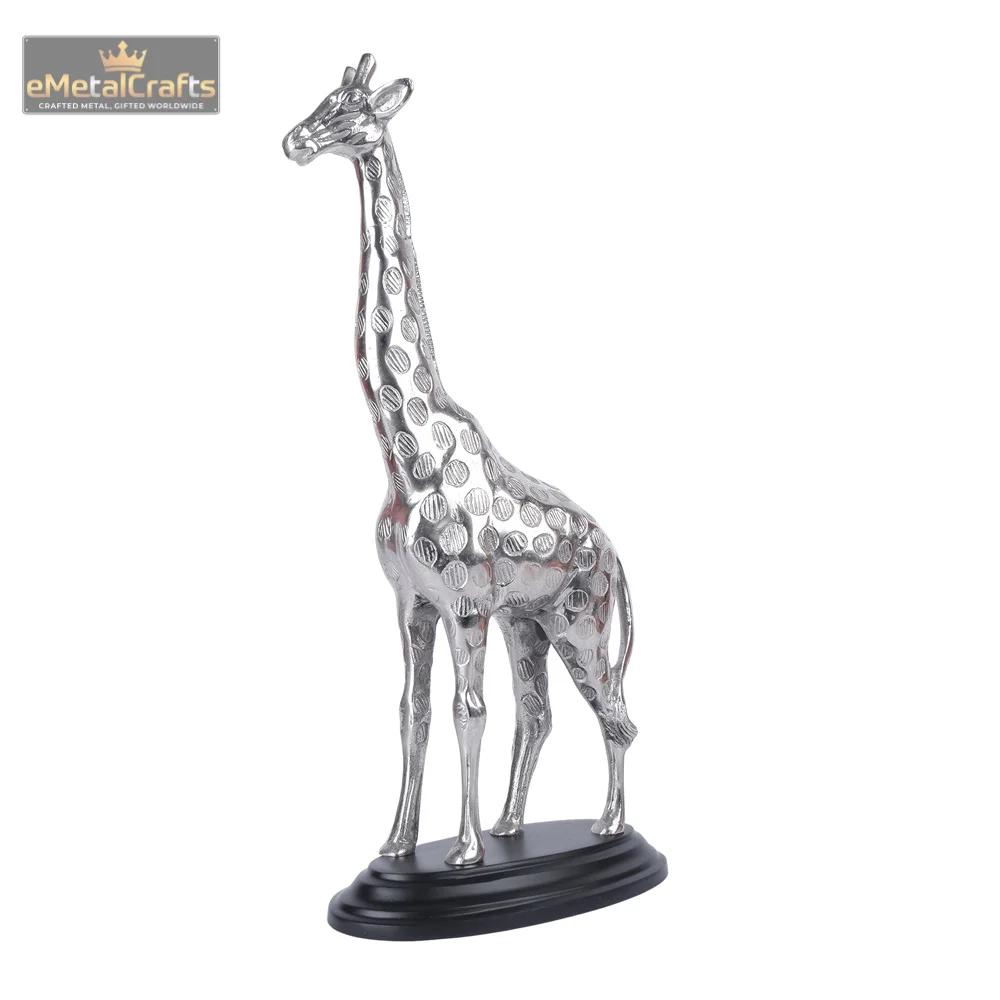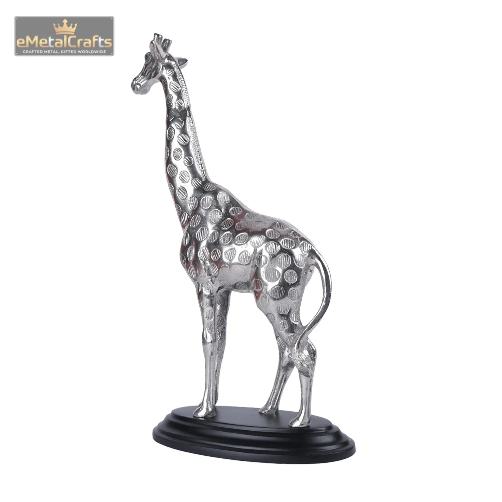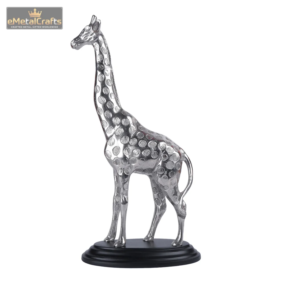 A sleek silver metal giraffe Statue with intricate detailing, mounted on a black oval base—perfect as an elegant centerpiece or unique gift.