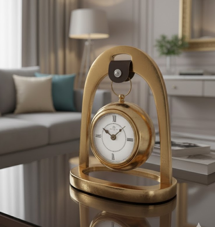 A vintage-style hanging table top clock designed to add timeless charm to your space. Crafted with a classic Roman numeral dial, this elegant piece hangs beautifully within a sleek arch frame. Ideal for desks, side tables, or gifting, it blends functionality with a touch of old-world grace.