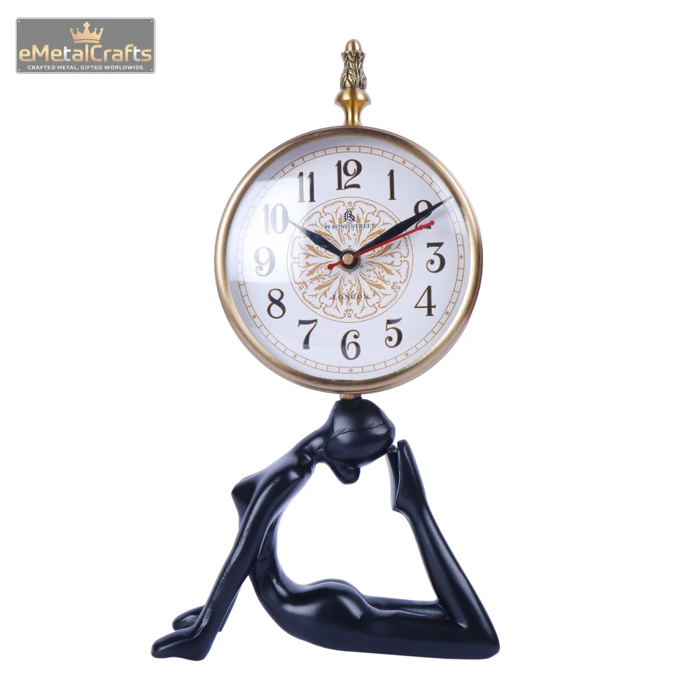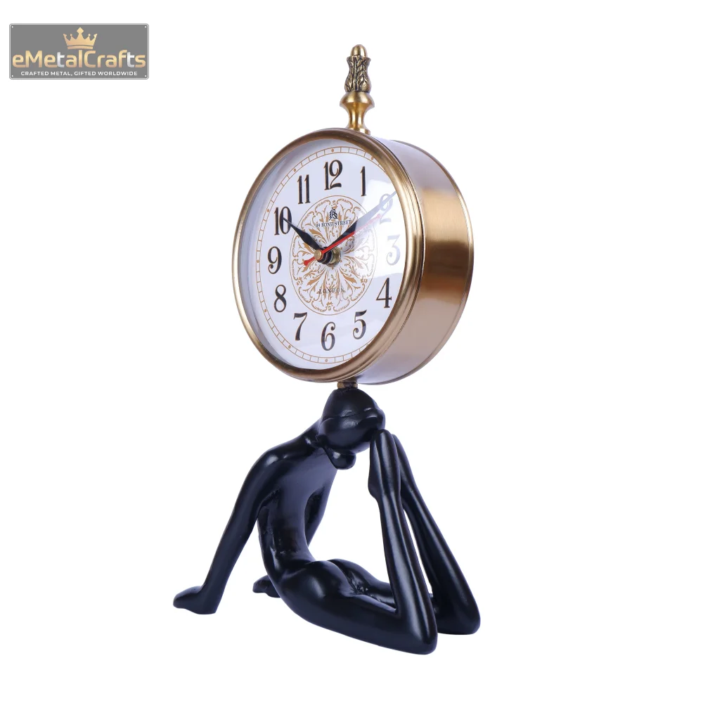 This unique vintage-style Lady table clock features bold Roman numerals on a crisp white dial, encased in a gold-colored metal frame with decorative elements. The clock is creatively mounted on a black figurine of a person in a reclining yoga pose, serving as a stylish stand. A perfect blend of function and art, this timepiece adds a distinctive touch to office desks, bookshelves, or study corners.