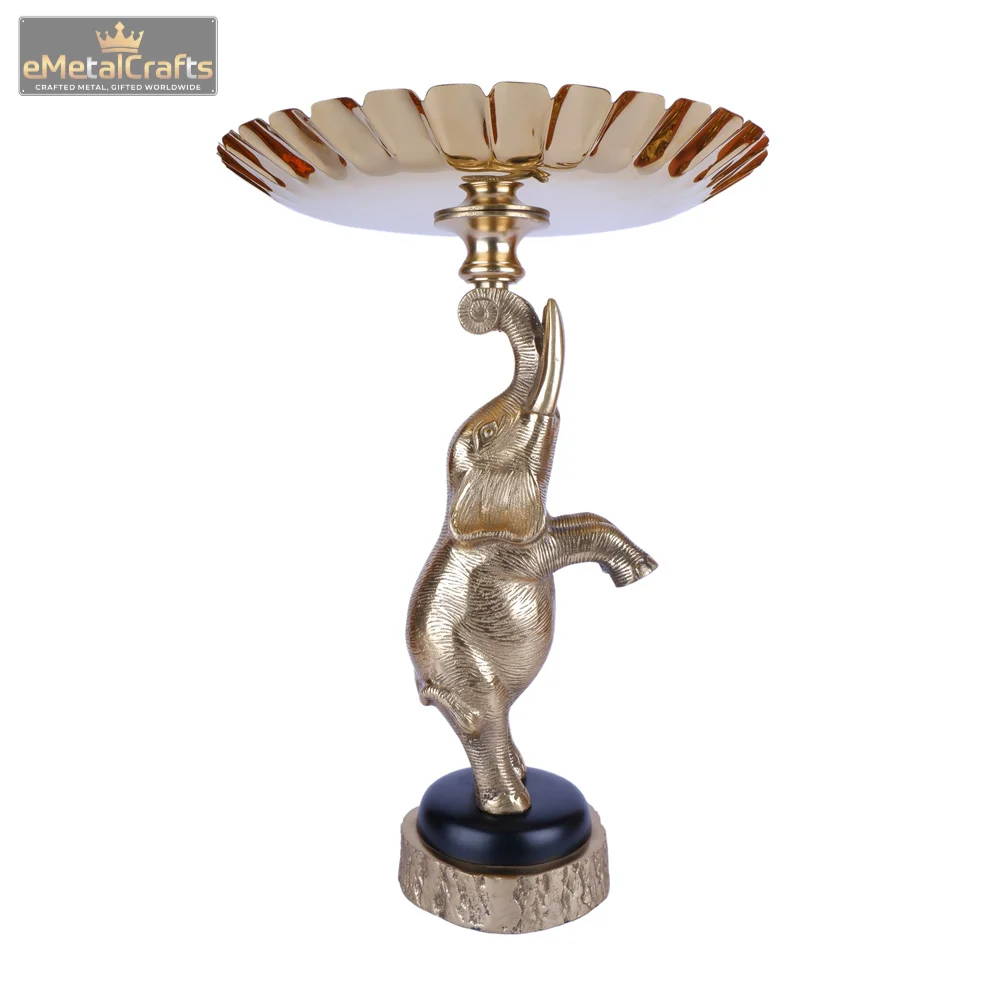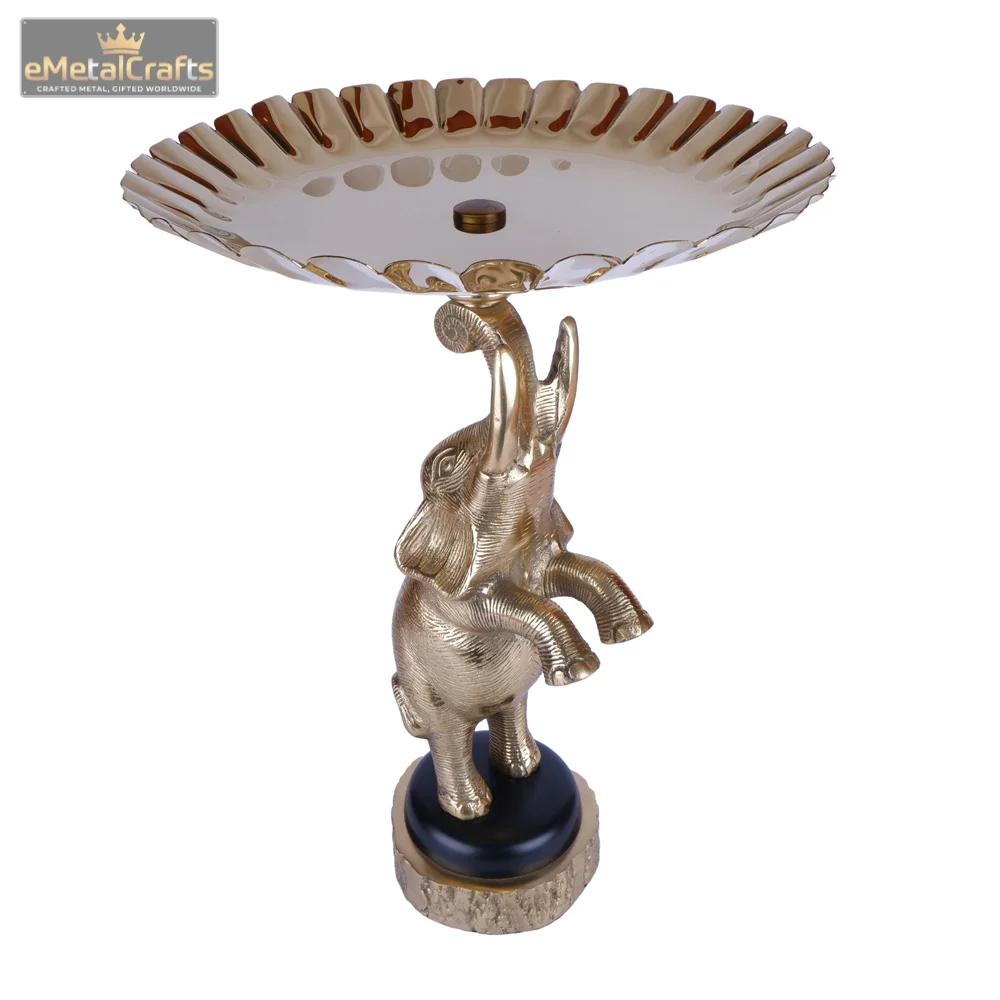 Color: Golden elephant and tray; Mixed golden/natural texture and black for the base.