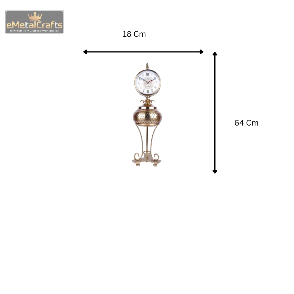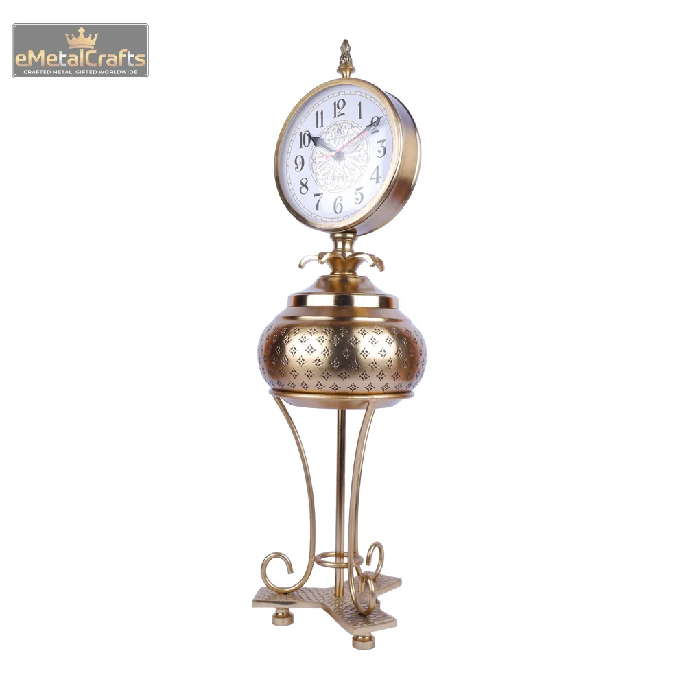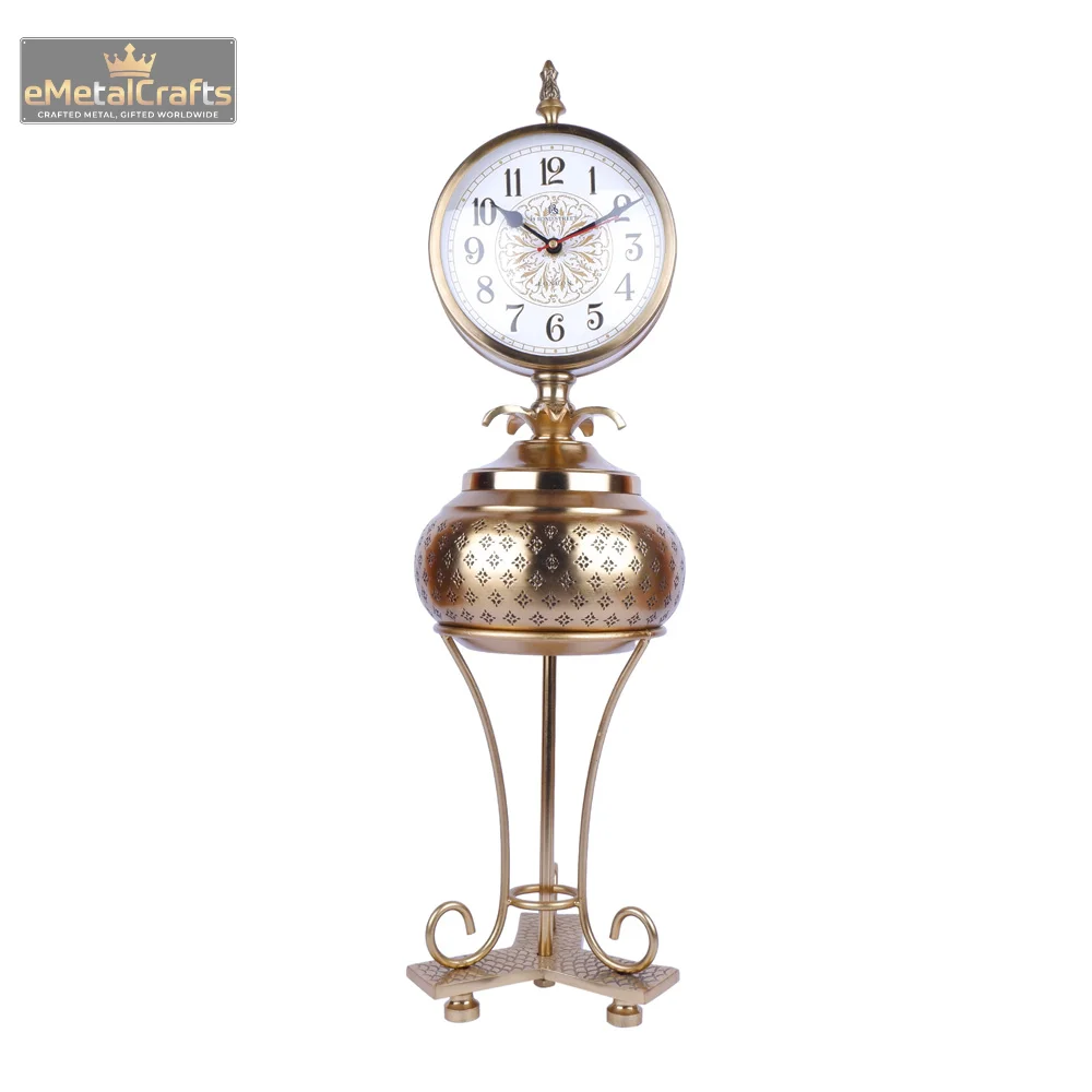 This elegant vintage-style table aluminium gold finish clock features bold Roman numerals on a crisp white dial, encased in an ornate gold metal frame with intricate patterns. The clock is adorned with a decorative crown and a bulbous base, supported by a sturdy tripod stand with curved legs, adding a nostalgic touch. Perfect for enhancing the aesthetic of office desks, bookshelves, or study corners.