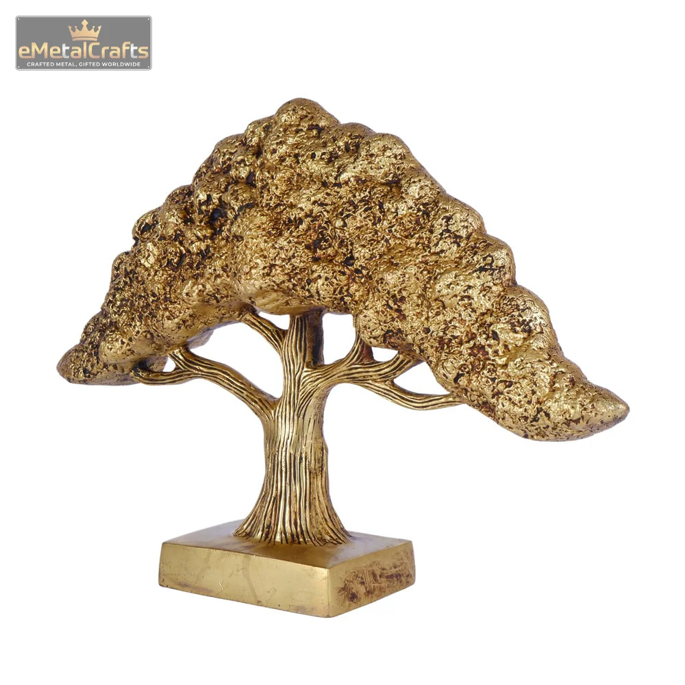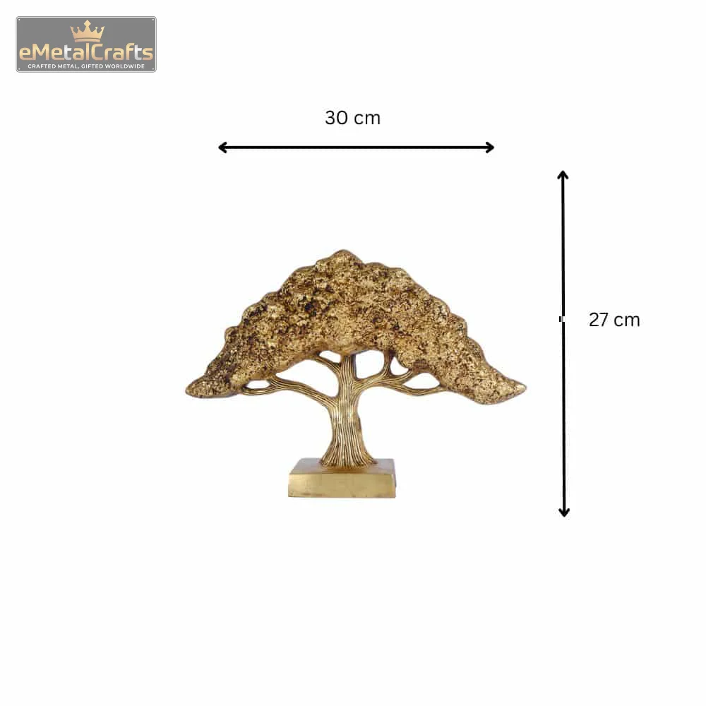 This elegant decorative piece features a detailed gold-colored metal brass golden bonsai plant sculpture with a textured canopy and intricate branching, mounted on a sturdy gold base. The imaginative craftsmanship infuses a refined and organic charm, transforming it into a perfect highlight for office desks, bookshelves, or study corners.