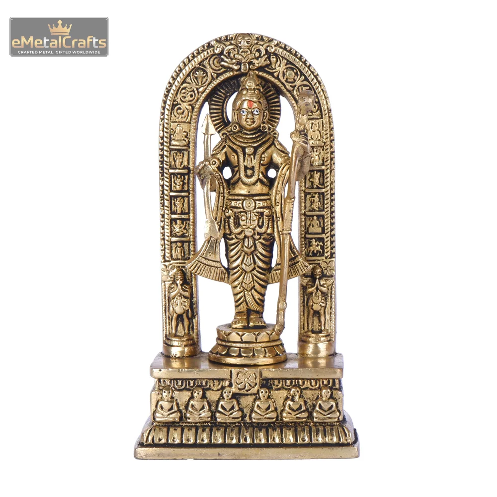 Gaze upon this imposing Best Rama God Statue in Brass, portrayed with dignity and poise within an elaborately embellished prabhavali (arch). This finely wrought piece depicts the Lord, symbolizing virtue and safeguarding, clearly holding His revered dhanush (bow). From His impressive crown and intricate adornments to His serene visage and the graceful drapes of His garments, every element showcases precision artistry. The magnificent arch boasts complex carvings, while the multi-tiered, robust pedestal is adorned with classic motifs, amplifying its dignified allure. Gleaming with an golden hue, this enduring and revered idol is superb for your spiritual space or home adornment, bestowing courage, righteousness, and profound spiritual benefits.
