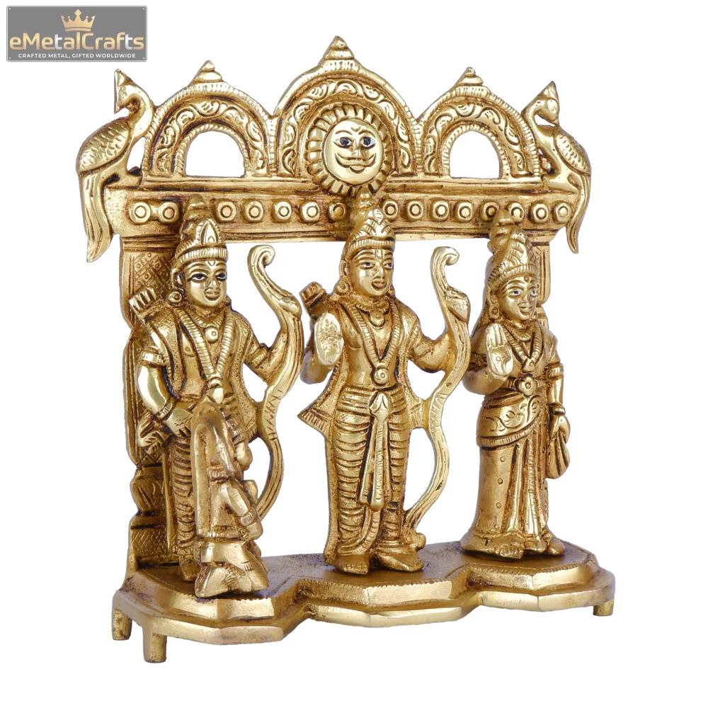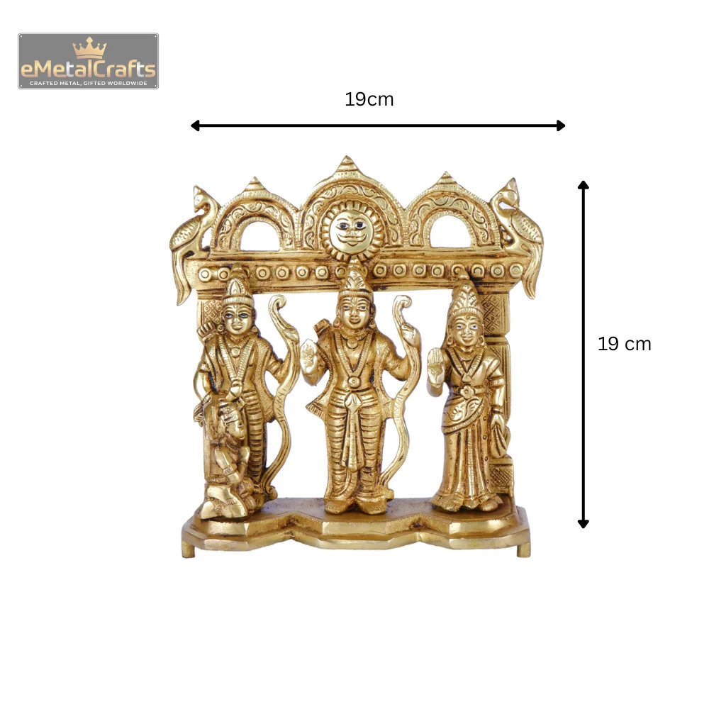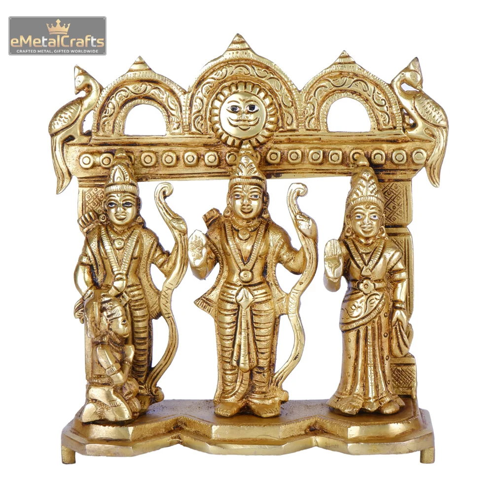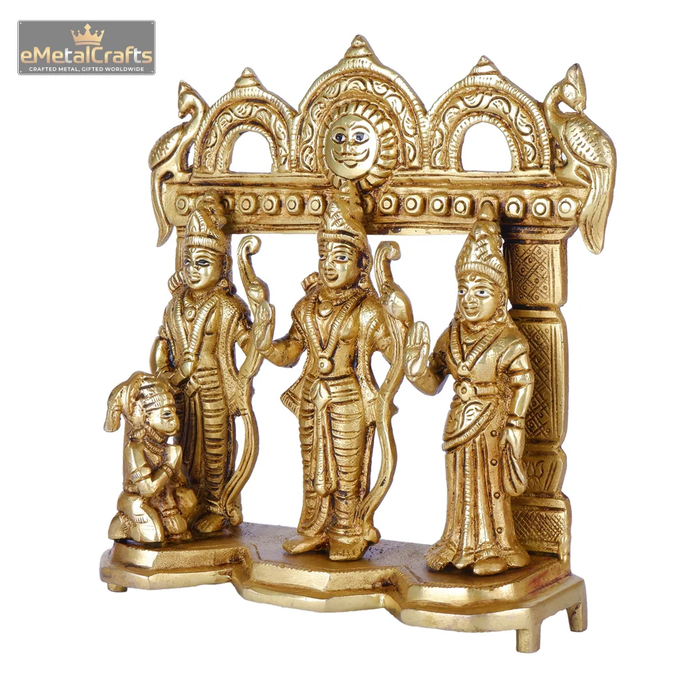Where Lord Rama stands centrally, accompanied by Goddess Sita, his loyal brother Lakshmana, and the devoted Hanuman, positioned humbly at their feet. Each figure is brought to life with applied hues on their raiment and crowns. An intricate, multi-tiered archway frames the deities, itself featuring fine details. This substantial piece, crafted from pure brass, displays a subtle shine on its unpainted sections. It serves as a profound symbol of righteousness, familial harmony, and unwavering devotion for any sacred space or cherished collection.