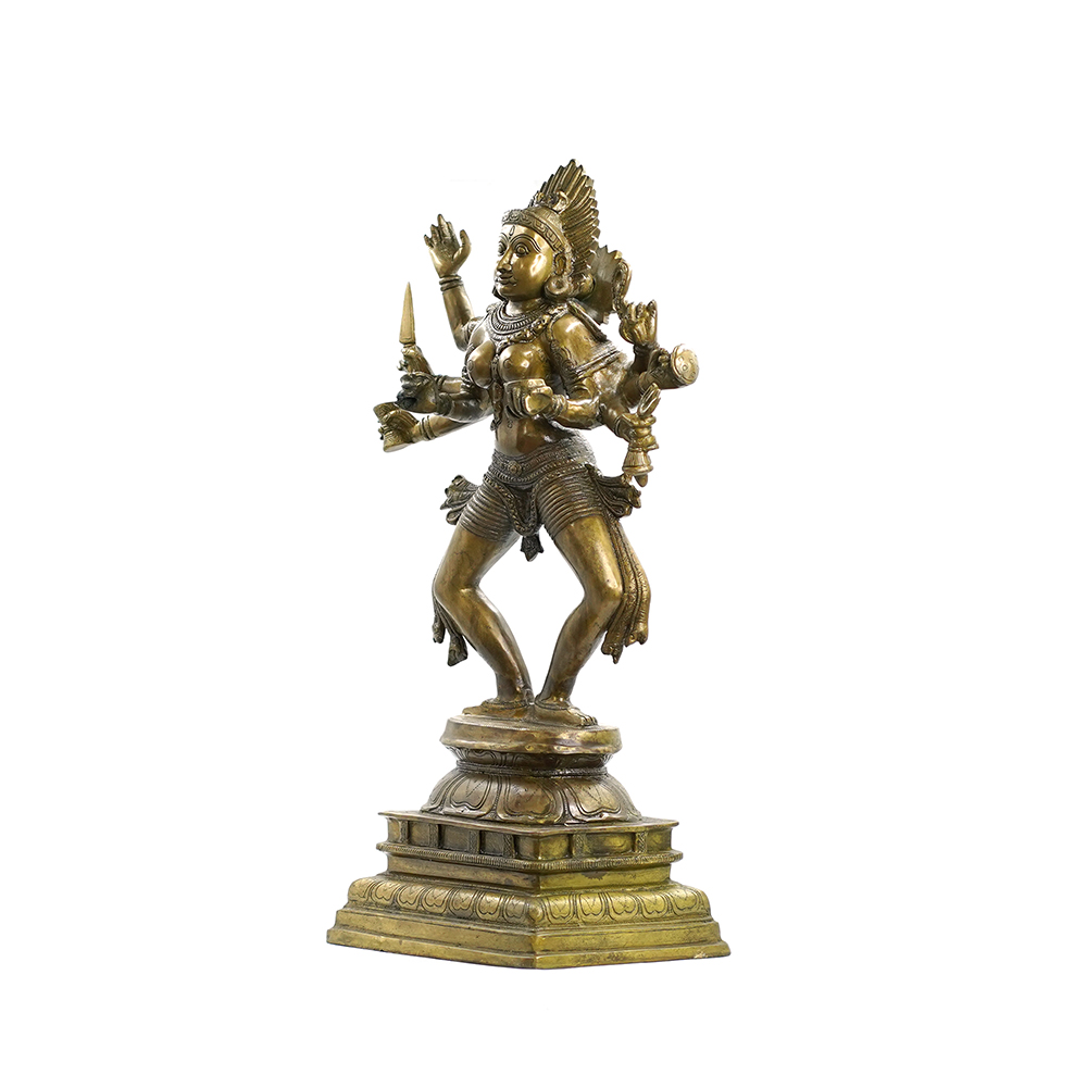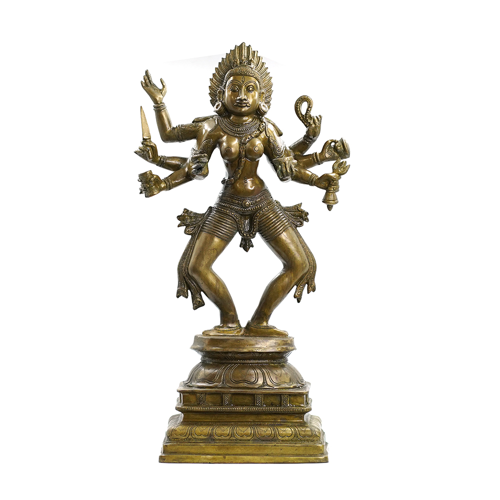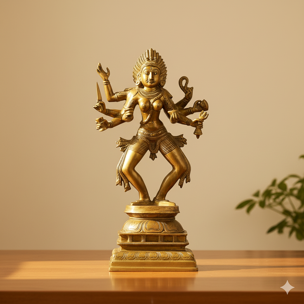 Invoke divine energy into your space with this powerful and intricately sculpted statue of Bhairavi Kali Mata, a fierce embodiment of feminine strength and cosmic power. This stunning piece is expertly crafted in a rich brown finish, symbolizing prosperity and spiritual awakening. Depicted with multiple arms, each holding symbolic weapons and gestures (mudras), the statue captures the dynamic presence and protective force of the goddess. Standing poised on a tiered pedestal, the sculpture showcases fine detailing in the facial features, attire, and ornaments—an exemplary representation of traditional Indian craftsmanship. Perfect for home altars, meditation spaces, or as a centerpiece of cultural décor, this statue brings with it an aura of empowerment, protection, and spiritual grace.