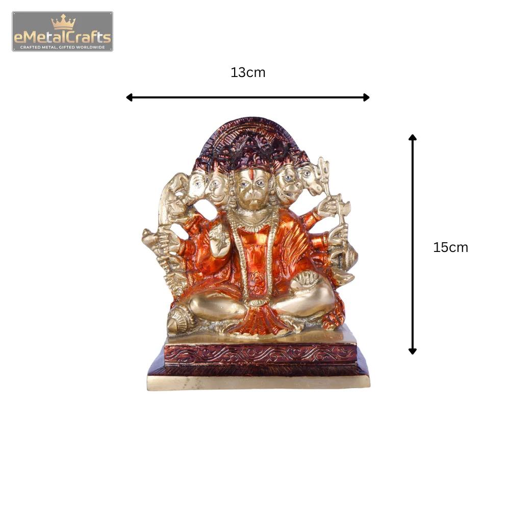 This striking brass idol depicts Pure Brass Bhavya Panchmukhi Hanuman Idol in his revered Panchamukhi (five-faced) form, symbolizing his comprehensive power and protection. Each of the five faces—Hanuman, Hayagriva, Narasimha, Garuda, and Varaha—is intricately detailed, and the idol features multiple arms, each holding various divine attributes. The idol is exquisitely hand-painted with rich reddish-brown and golden tones, accentuating the fine craftsmanship and powerful presence of the deity. Seated in a meditative posture on a decorative base, this Panchamukhi Hanuman idol emanates an aura of immense strength, devotion, and fearlessness. It serves as a potent spiritual symbol, ideal for a sacred space to invite courage, victory over obstacles, and divine blessings into your home or office.