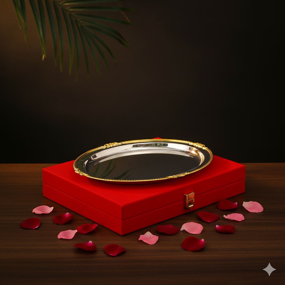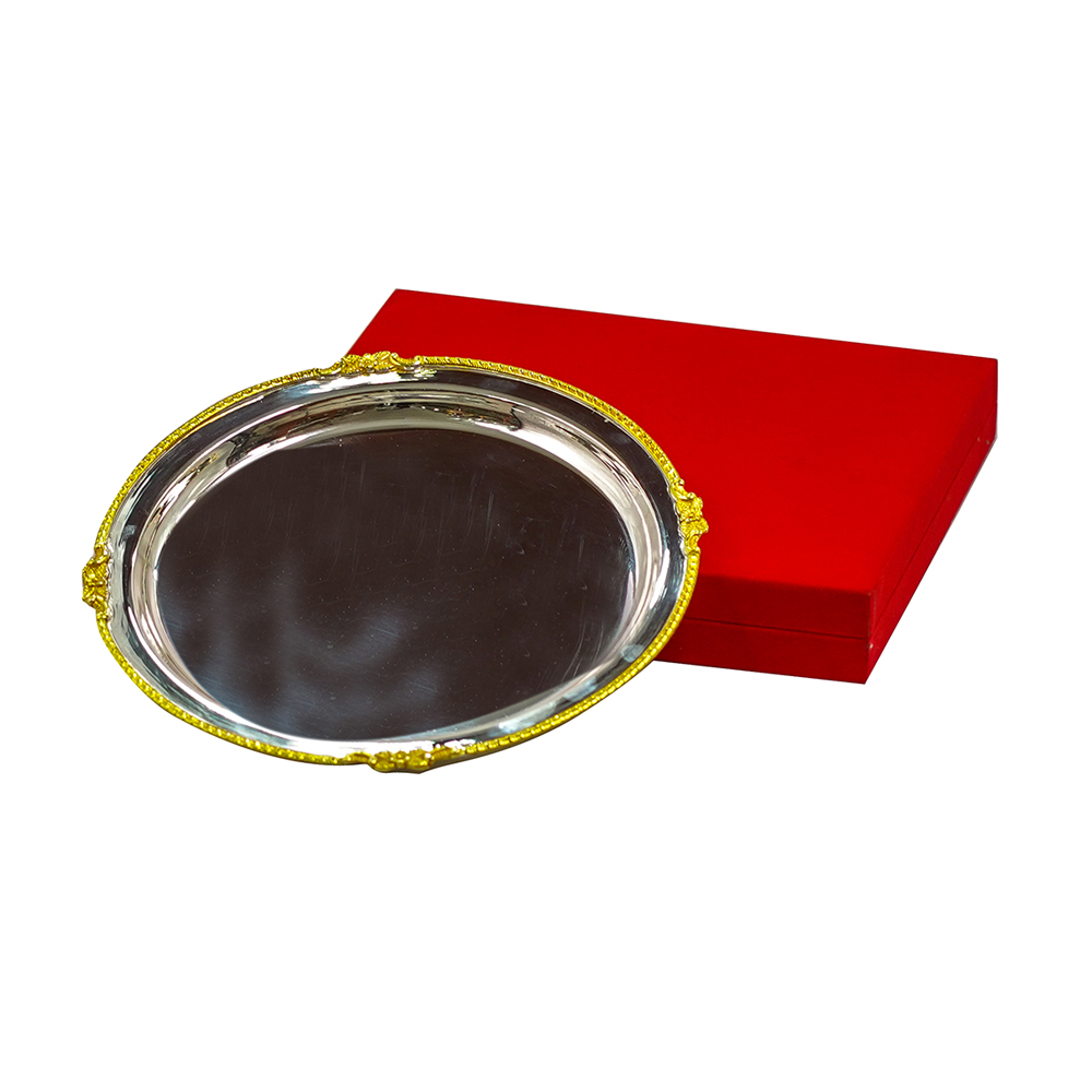 Elegant brass plate gift box with a polished silver finish, gold border, and red box — perfect for ceremonies, décor, or gifting.