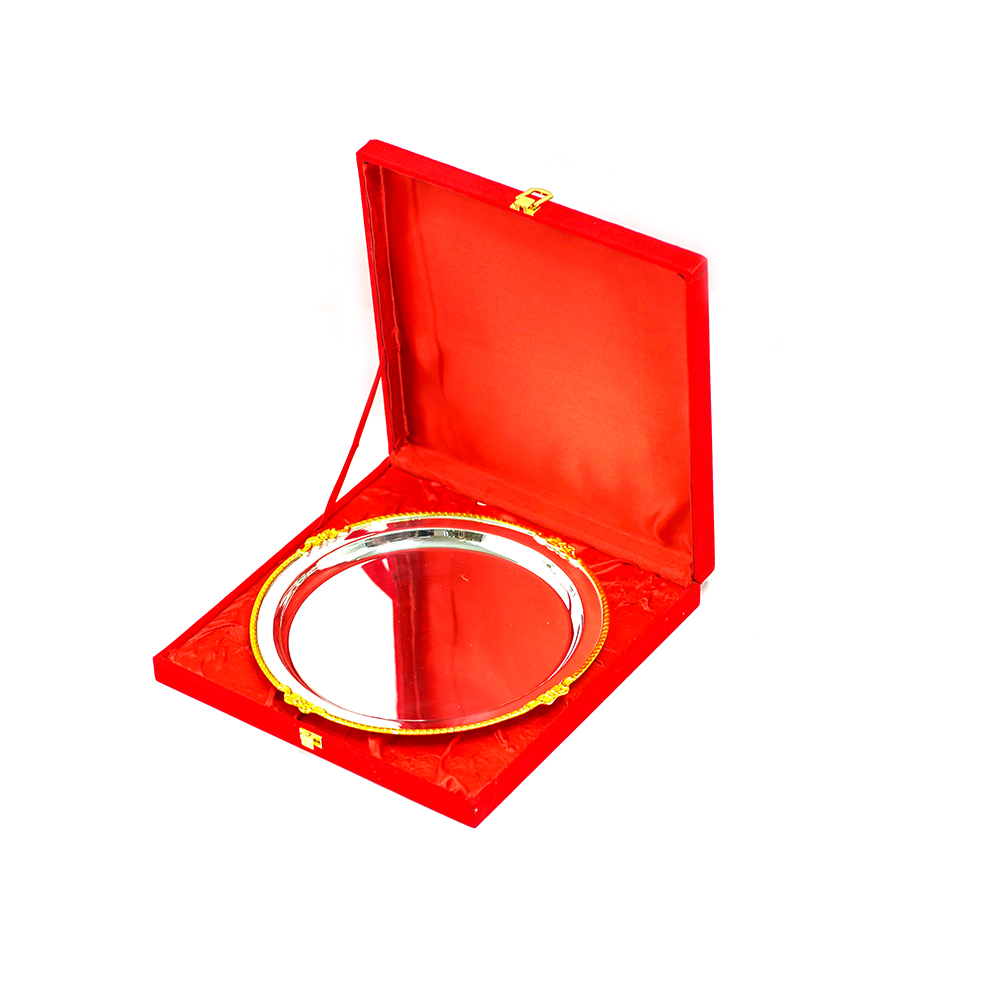 Presented in a vibrant red box, this brass plate gift box showcases a polished silver surface bordered with delicate gold accents. Its refined craftsmanship makes it perfect for ceremonial use or as an elegant decorative piece in your home. This classic design blends heritage and style, making it a thoughtful gift or a distinguished addition to any collection.