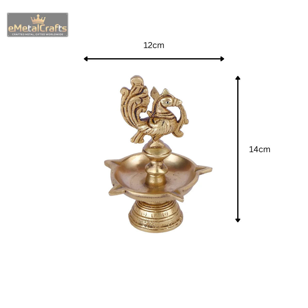 This beautifully crafted pure brass annam pooja diya lamp integrates a detailed peacock figure directly into its design, symbolizing grace, beauty, and auspiciousness. The peacock, with its intricately sculpted feathers and elegant stance, rises from behind the oil lamp bowl, acting as a decorative back support. The diya itself features a traditional well for oil and wick, surrounded by a charmingly etched rim. Pure brass annam pooja diya lamp resting on a sturdy, multi-petaled base, this piece combines the functionality of a traditional lamp with exquisite artistic detail. It is perfect for daily worship, festive celebrations, or as a captivating decorative item, bringing light and cultural elegance to any space.