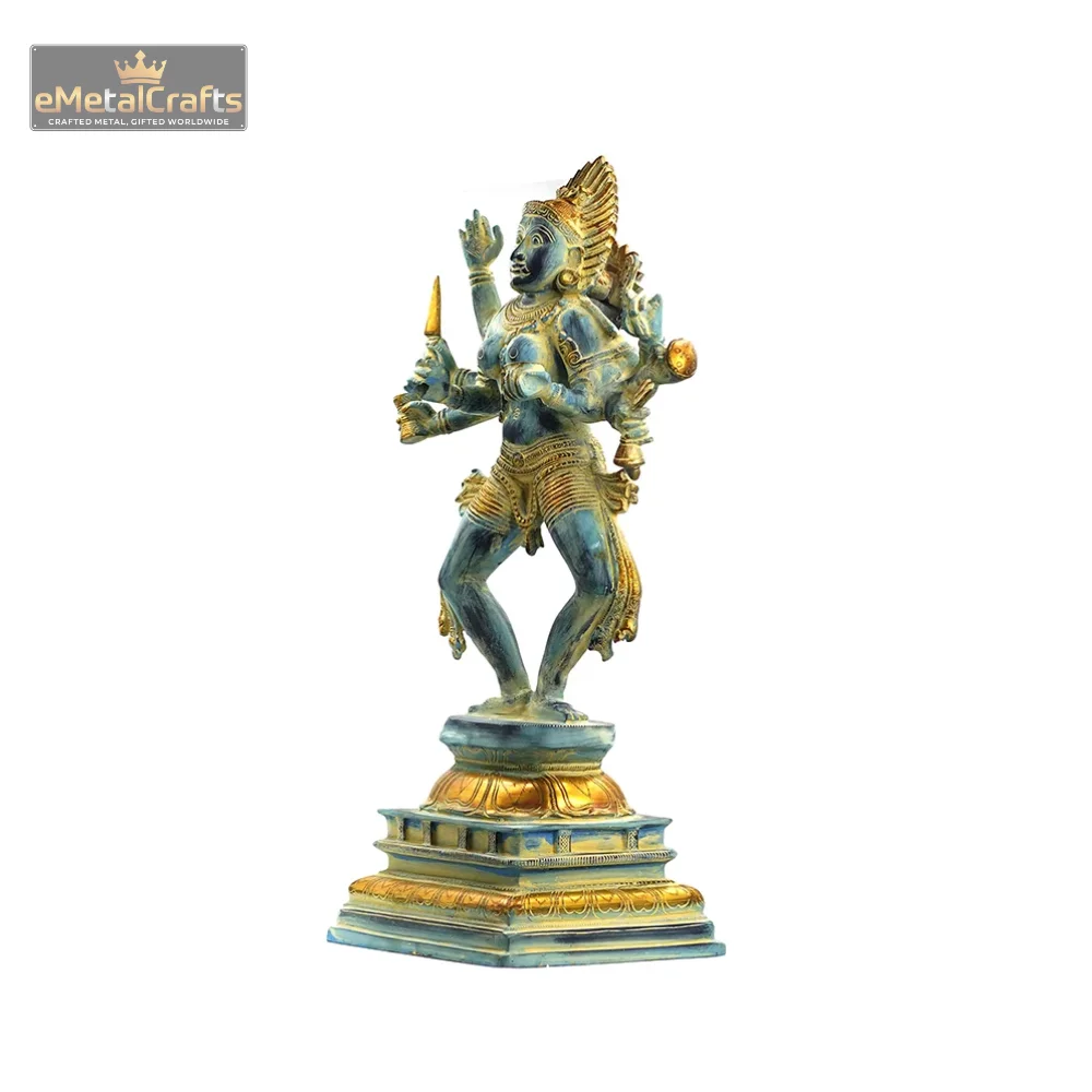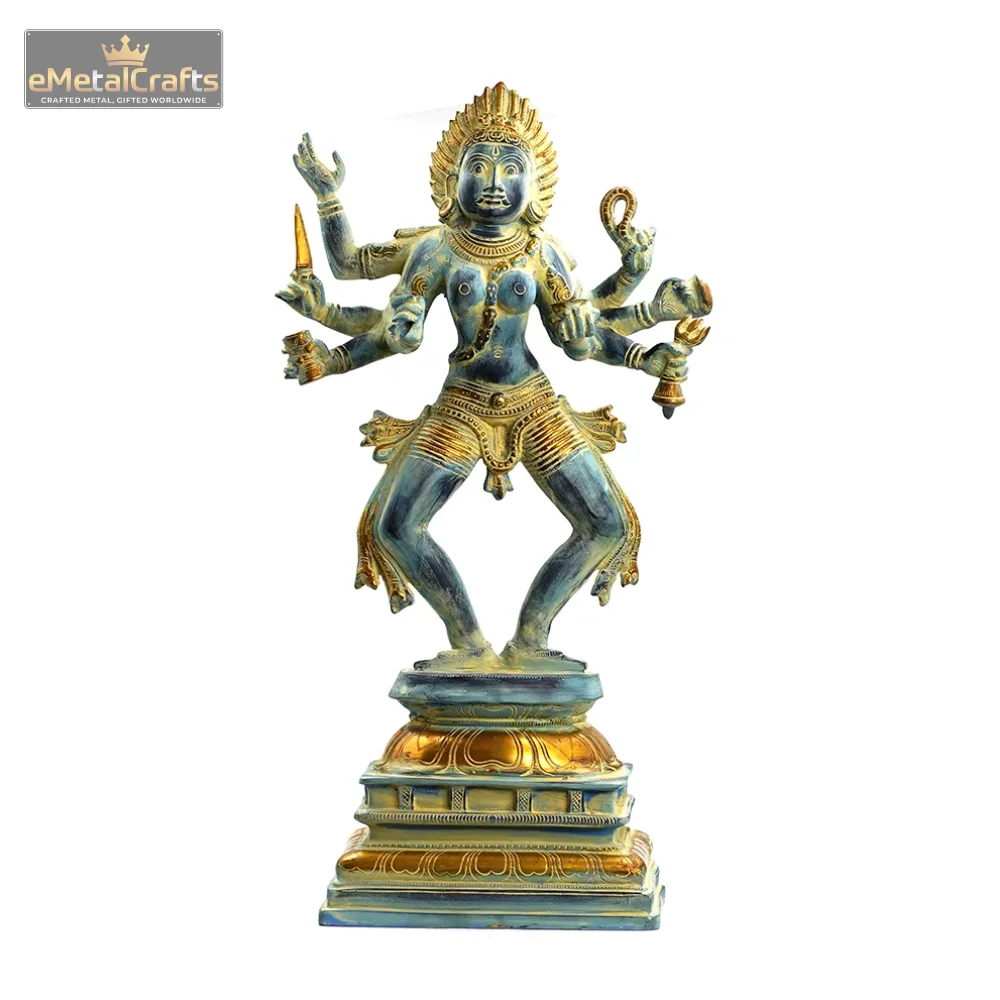 Invoke divine energy into your space with this powerful and intricately sculpted statue of Brass Bhairavi Maa Kali , a fierce embodiment of feminine strength and cosmic power. This stunning piece is expertly crafted in a rich blue-grey finish with a golden tone, symbolizing prosperity and spiritual awakening. Depicted with multiple arms, each holding symbolic weapons and gestures (mudras), the statue captures the dynamic presence and protective force of the goddess. Standing poised on a tiered pedestal, the sculpture showcases fine detailing in the facial features, attire, and ornaments—an exemplary representation of traditional Indian craftsmanship. Perfect for home altars, meditation spaces, or as a centerpiece of cultural décor, this statue brings with it an aura of empowerment, protection, and spiritual grace.