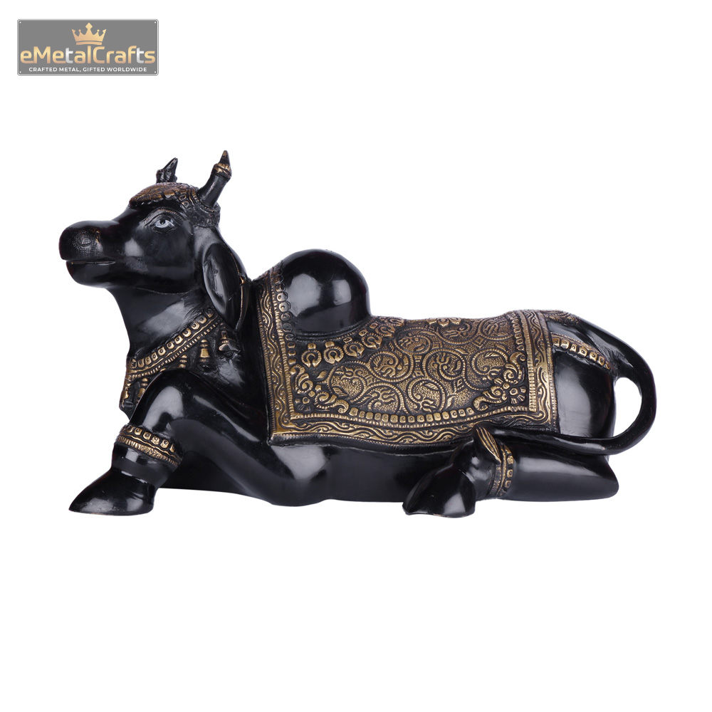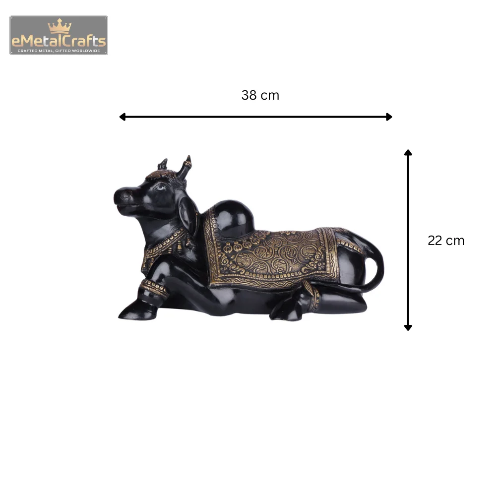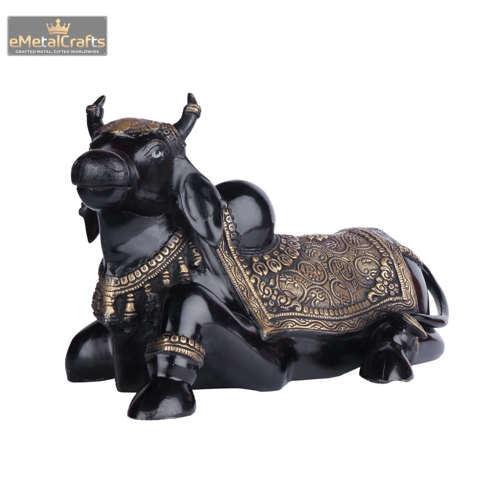 This magnificent Brass Black Nandi statue, the sacred bull and vahana (mount) of Lord Shiva, depicted in a serene reclining pose. The idol showcases a striking contrast with its deep black finish adorned with intricate golden detailing on the saddle and traditional ornaments, giving it a regal and auspicious appearance. Nandi symbolizes strength, devotion, and purity, making this idol a powerful addition to your spiritual space, garden, or as a distinguished decorative piece. It is perfect for those seeking blessings of patience and righteousness, or as a profound gift.