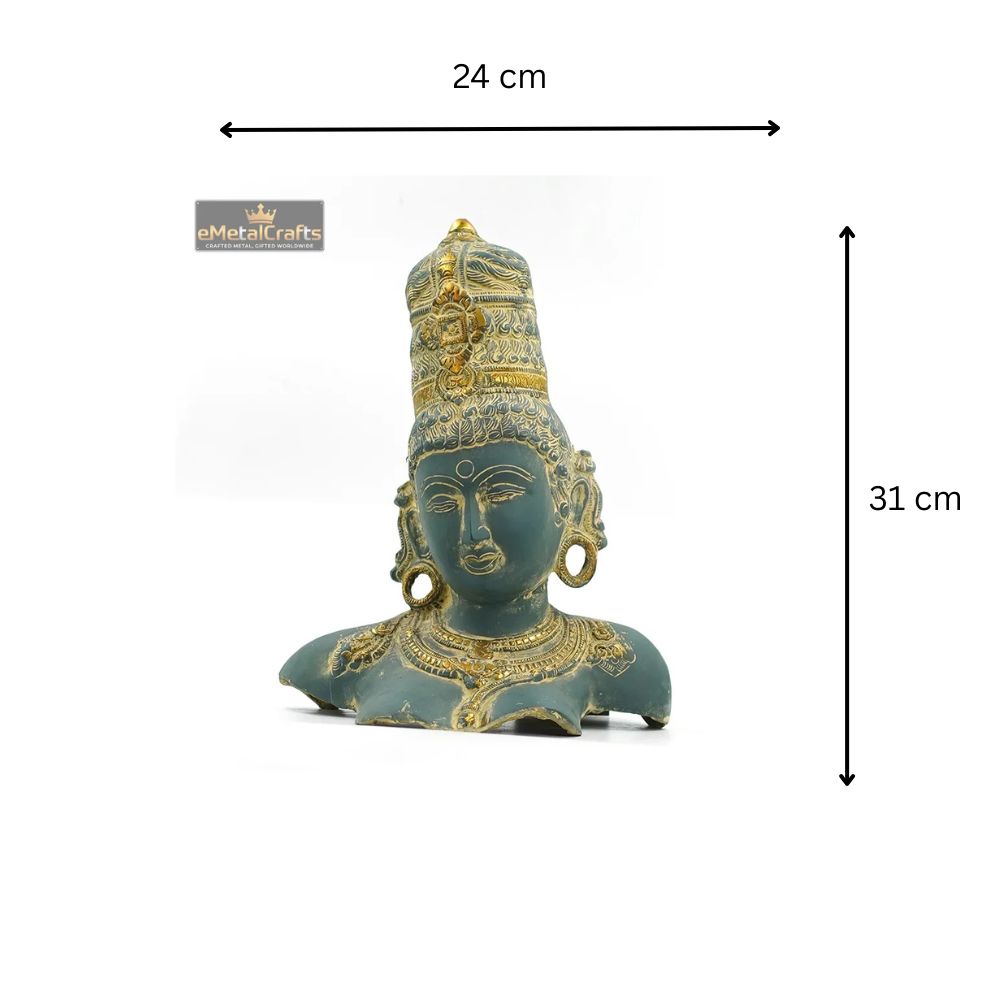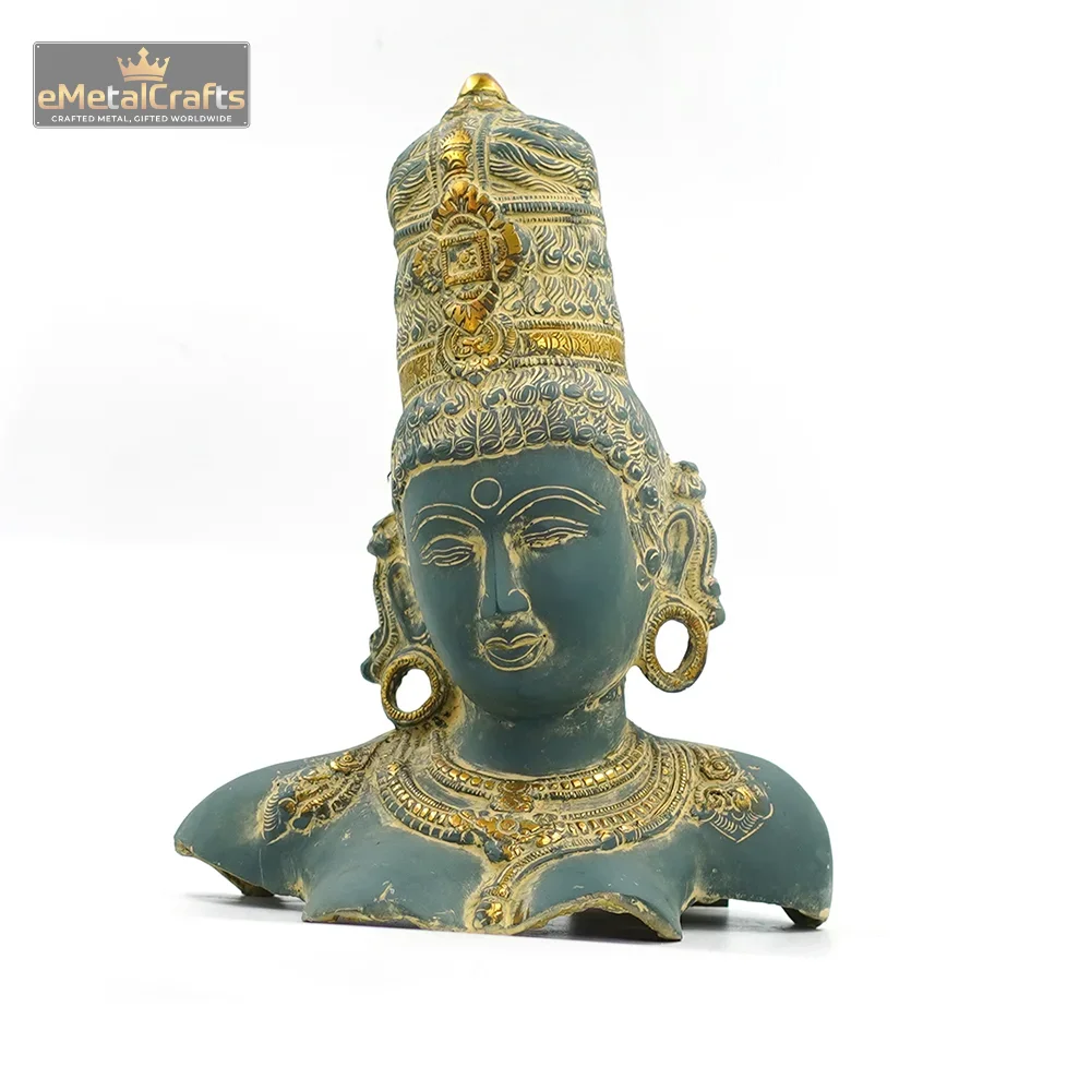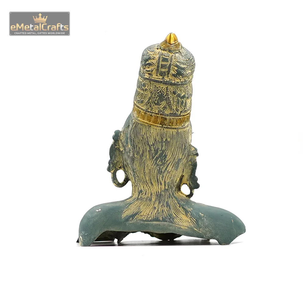 This serene sculpture of the Brass Buddha Face Statue embodies peace and meditation. It is finished with a stunning dual tone: a rich Azure patina covers the main surface of the brass, evoking the colors found on naturally weathered copper or jade. This earth-toned finish provides a beautiful textural contrast to the brightly gilded brass accents that highlight the deity’s regal crown, earlobes, and finely detailed necklace. This magnificent piece, with its graceful, contemplative expression, is a powerful centerpiece for any space dedicated to tranquility and spiritual contemplation.