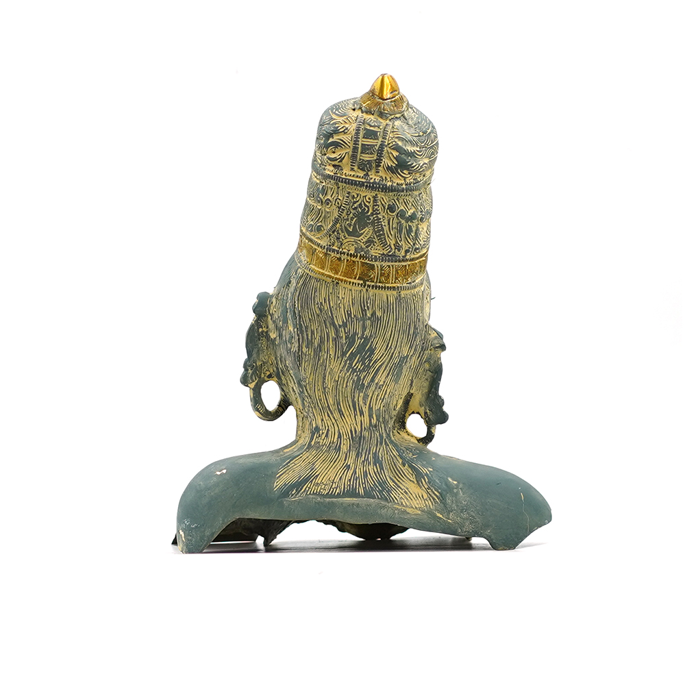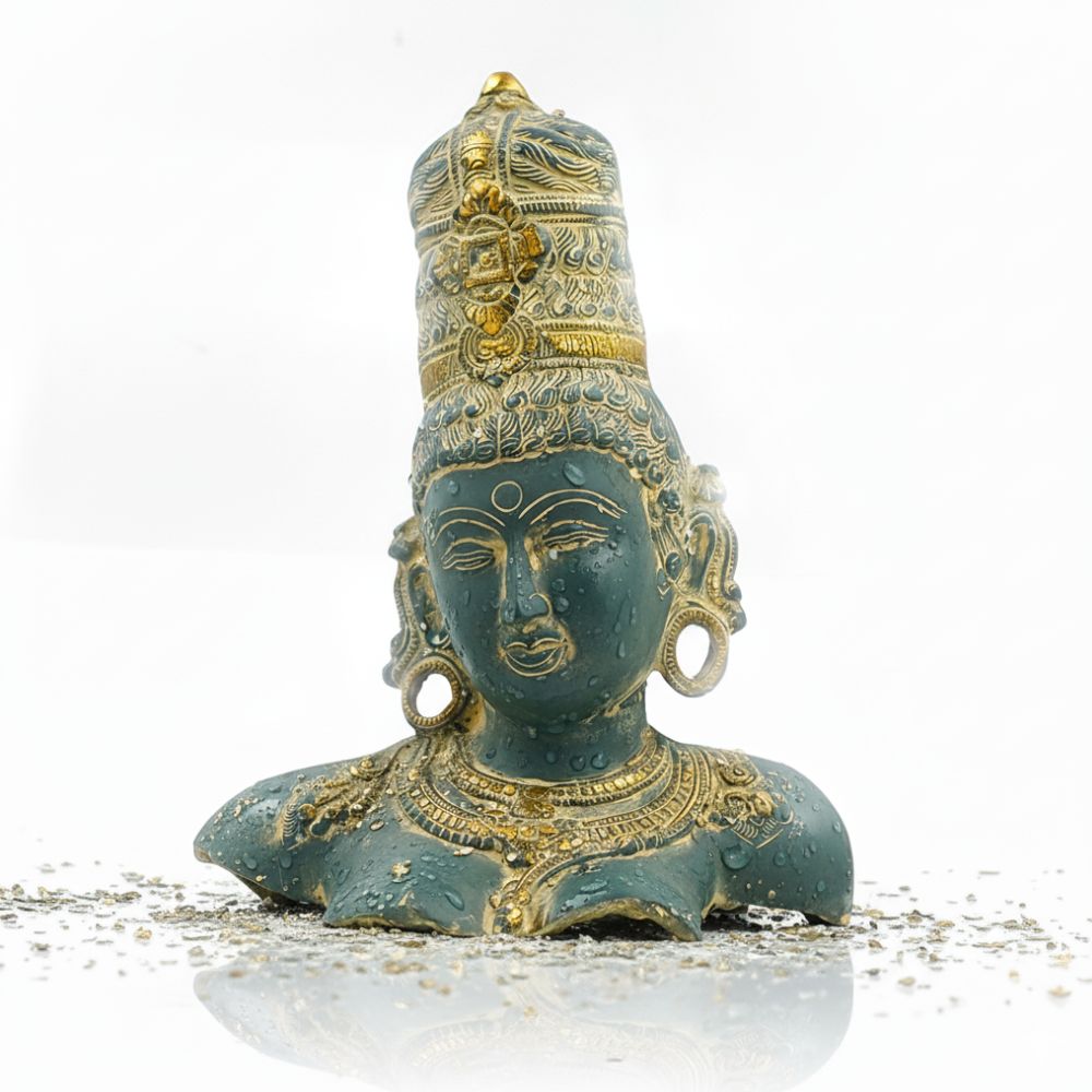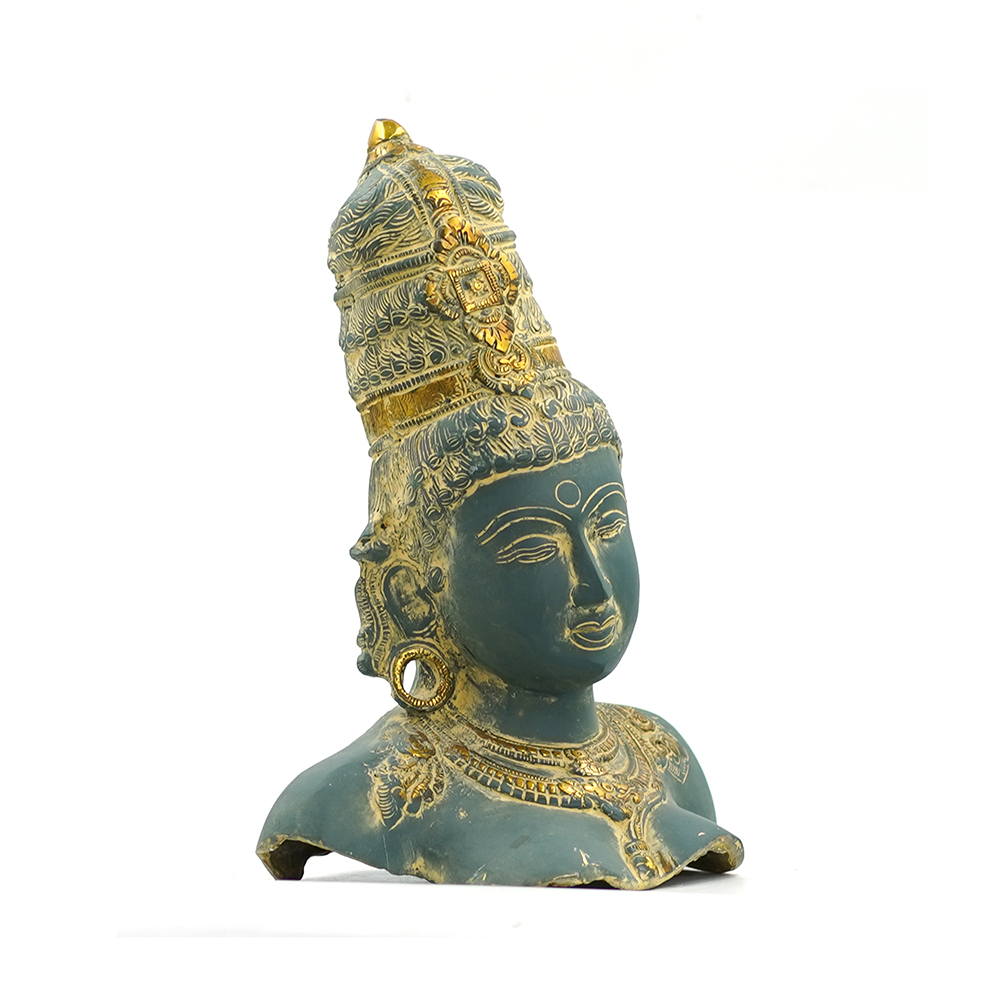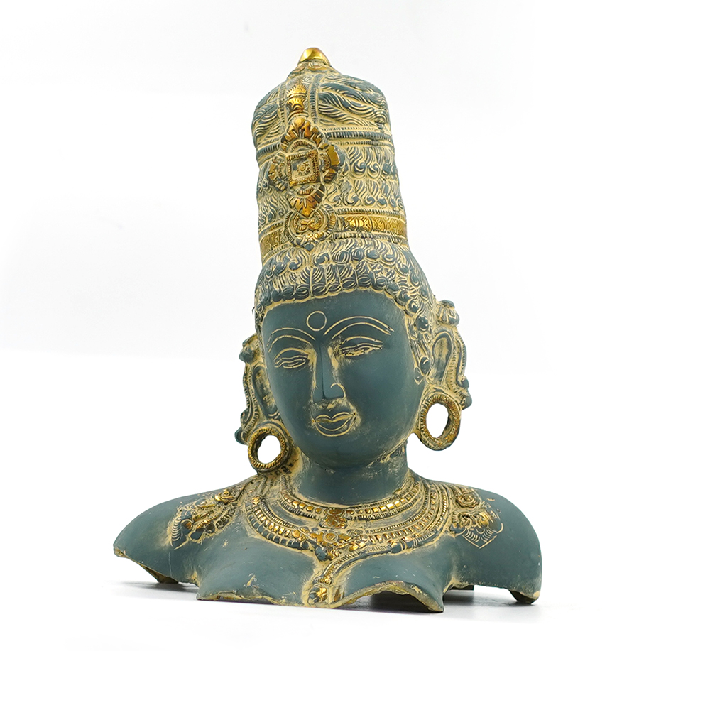This serene sculpture of the Brass Buddha Face Statue embodies peace and meditation. It is finished with a stunning dual tone: a rich Azure patina covers the main surface of the brass, evoking the colors found on naturally weathered copper or jade. This earth-toned finish provides a beautiful textural contrast to the brightly gilded brass accents that highlight the deity’s regal crown, earlobes, and finely detailed necklace. This magnificent piece, with its graceful, contemplative expression, is a powerful centerpiece for any space dedicated to tranquility and spiritual contemplation.
