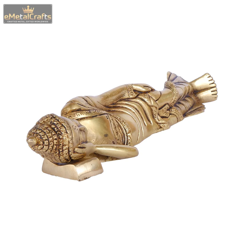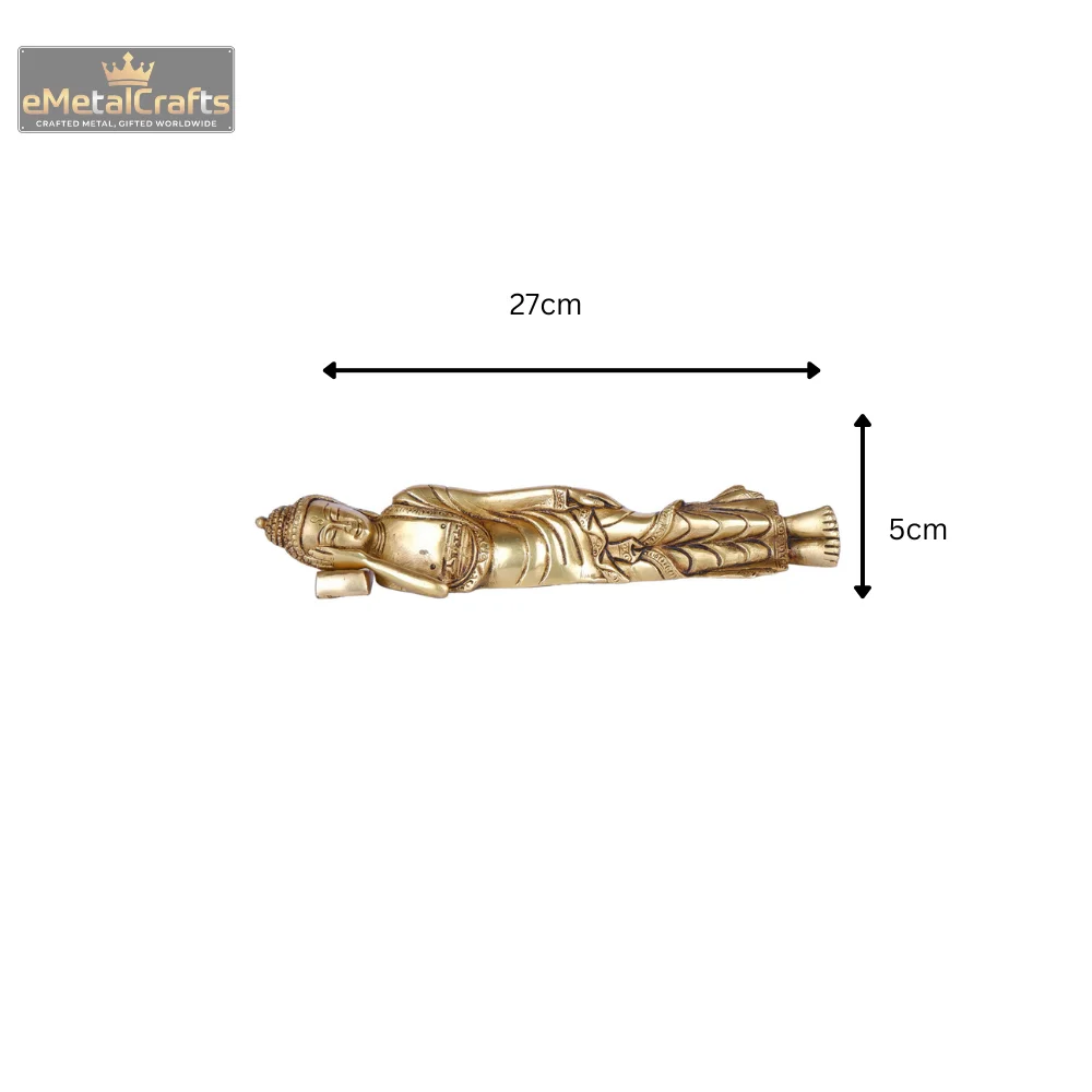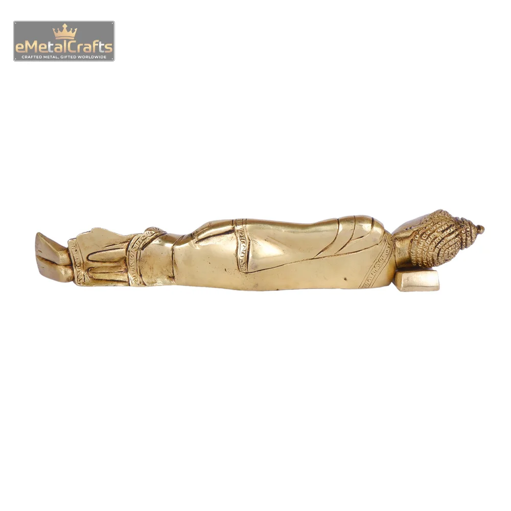 This serene brass idol portrays Pure Brass Buddha Idol in the classic reclining posture (Parinirvana Mudra), symbolizing his final moments before achieving nirvana, or the complete cessation of all suffering and desire. The idol is meticulously crafted to capture the peaceful expression and draped robes, with his head gently resting on his hand, conveying an ultimate state of tranquility and enlightenment. The elongated form and detailed features emphasize a sense of spiritual release and profound peace. This powerful piece serves as a timeless reminder of the path to inner peace and detachment, making it an ideal addition to a meditation space, a spiritual collection, or any area seeking a calming and reflective atmosphere.