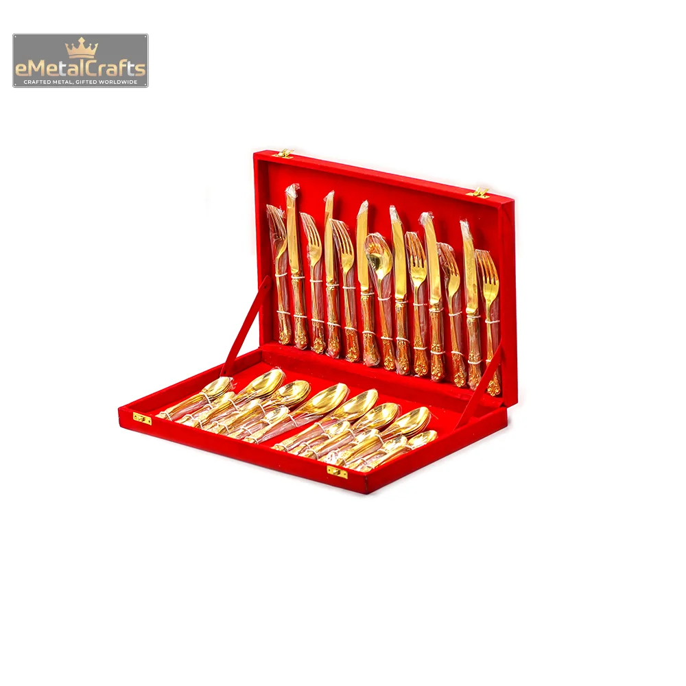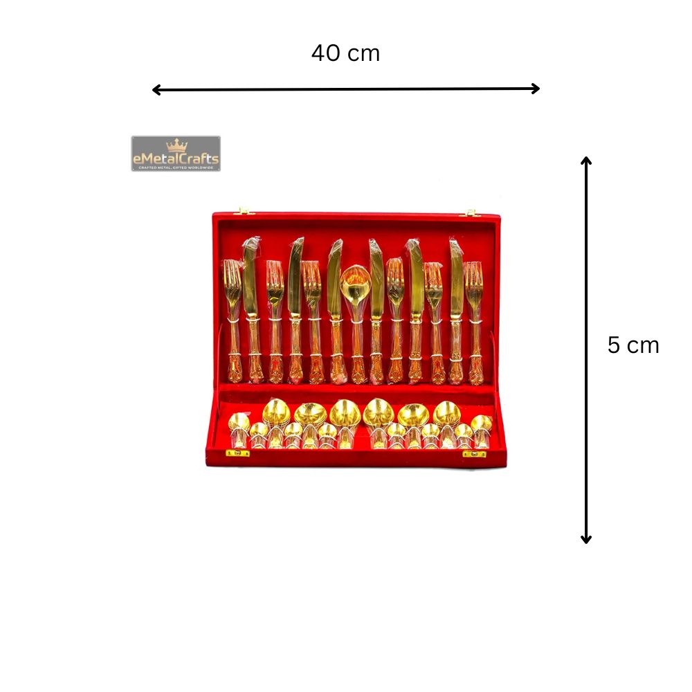 A luxurious solid brass cutlery set with polished gold finish, elegantly presented in a crimson velvet box—perfect for gifting and formal dining.
