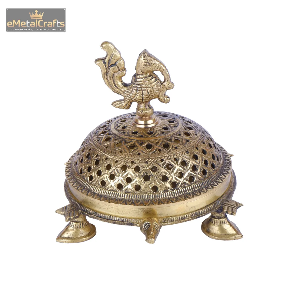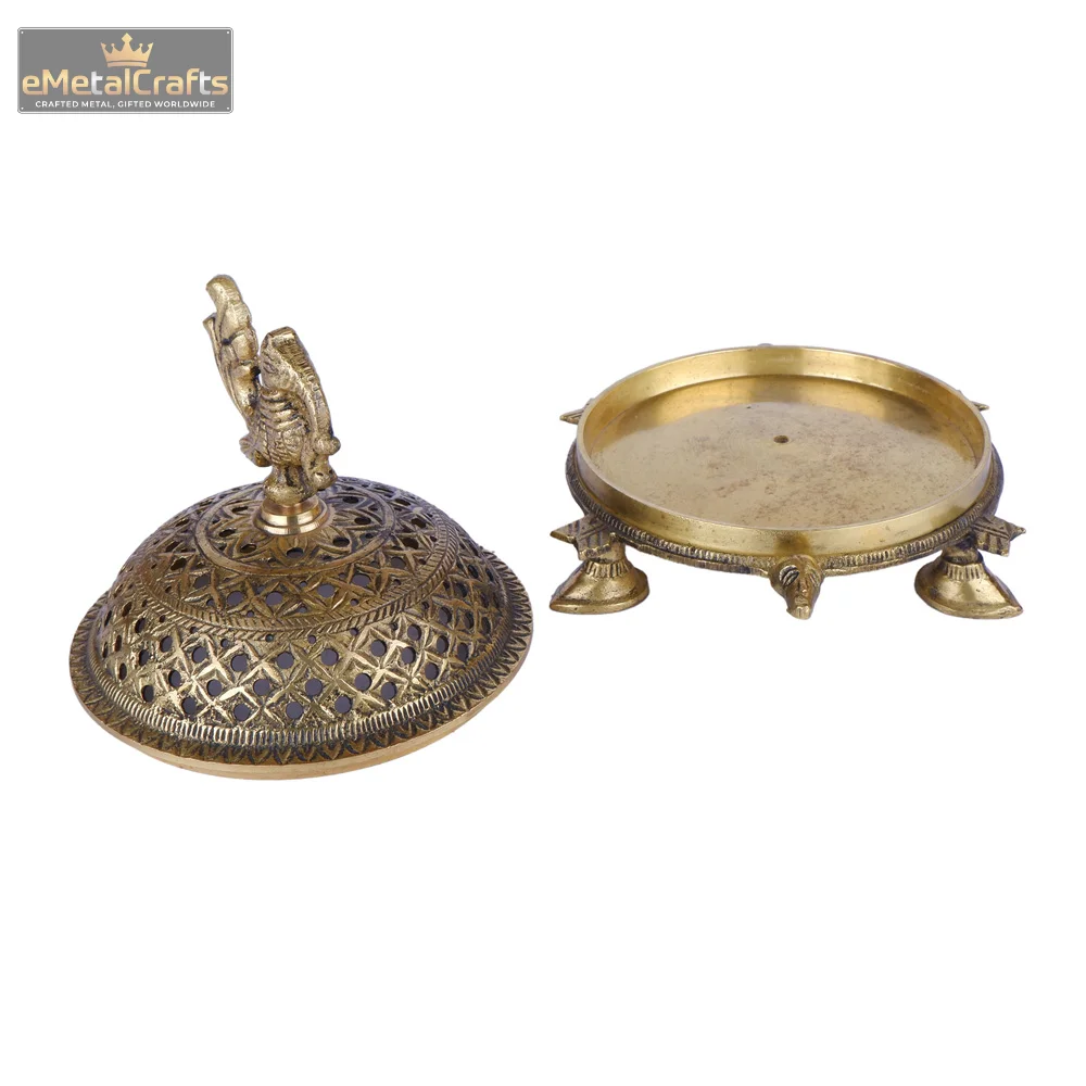 This finely designed brass dhoopdani incense holder is perfect for traditional rituals, filling your space with the purifying aroma of loban or incense. The dome features beautifully detailed lattice cutwork patterns for smooth smoke diffusion. Supported by intricately crafted ornamental legs, it combines stability with aesthetic appeal. Ideal for pooja rooms, temples, or meditation spaces, this piece adds a traditional charm while serving a functional purpose.