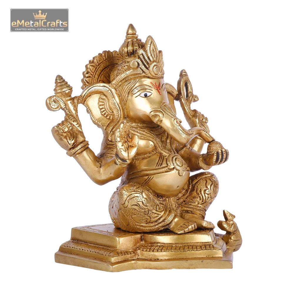 Invite blessings with this intricately crafted Brass Ganesha Statue, featuring a traditional seated pose, gold finish, red tilak, and mouse mount—perfect for your altar or as a meaningful gift.