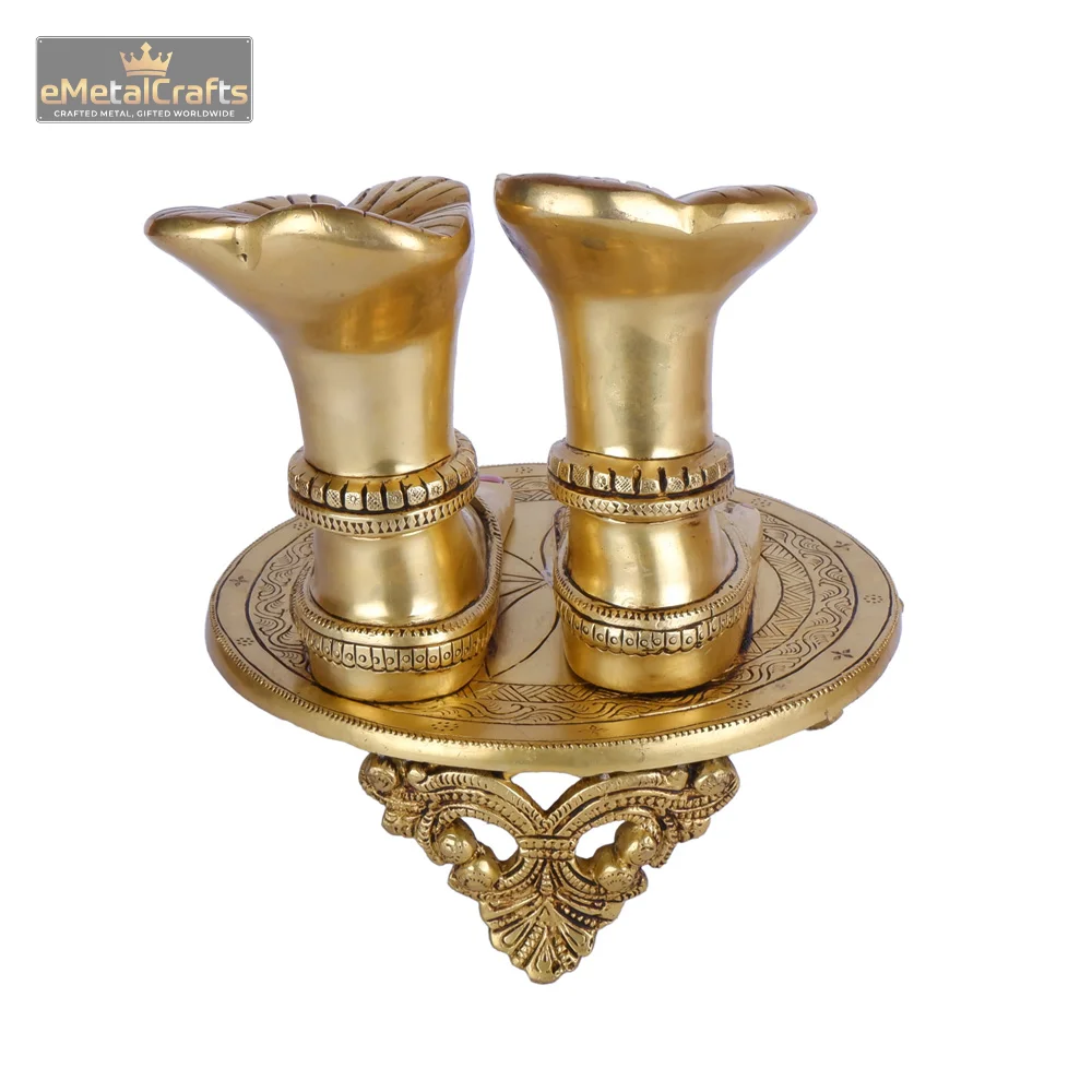 This intricately crafted brass statue represents the sacred feet of brass goddess lakshmi feet, known as Lakshmi Charan Paduka, symbolizing wealth, prosperity, and good fortune. Each foot is adorned with delicate details, including traditional anklets and toe rings, highlighted with touches of red and pink color, bringing the divine presence to life. The feet rest on a beautifully designed, elevated circular pedestal, which itself is intricately carved with traditional motifs, adding to the grandeur of the piece. Made from premium quality brass with a rich golden finish, this idol is revered for its ability to invite blessings and positive energy into the home or workplace. It serves as a powerful symbol of auspiciousness and devotion, making it a perfect addition to your puja altar, spiritual space, or as a thoughtful and blessed gift for housewarmings, festivals, and other special occasions.