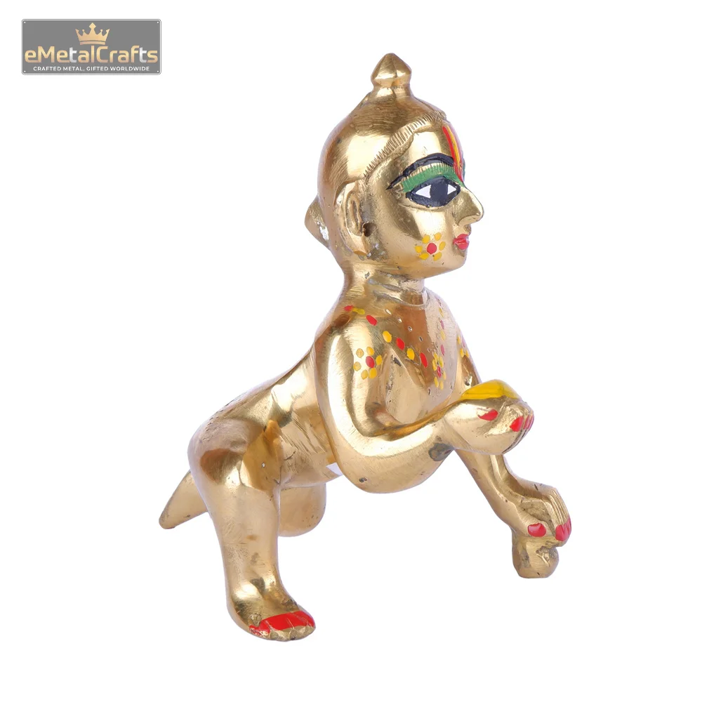 This endearing miniature brass idol depicts Baal Gopal, the beloved child form of Lord Krishna, in his iconic crawling posture. The idol captures the innocence and charm of baby Krishna, with one hand extended forward, often holding a laddoo (sweet), symbolizing his playful and mischievous nature. The idol is subtly adorned with details on his eyes, tilak on the forehead, and dots on his body, adding to its vibrant appeal. Crafted from polished brass, this delightful piece is perfect for personal altars, children’s rooms, or as a loving gift, inviting joy, prosperity, and the playful blessings of Lord Krishna into your home.