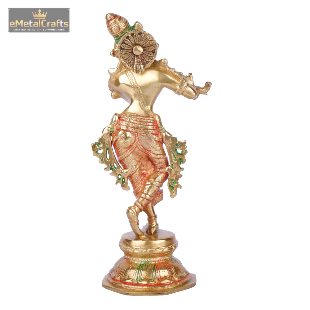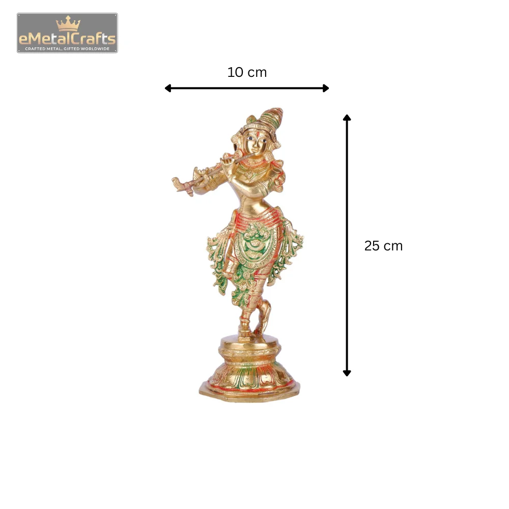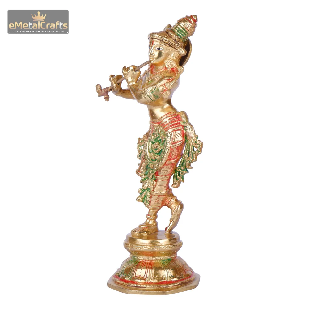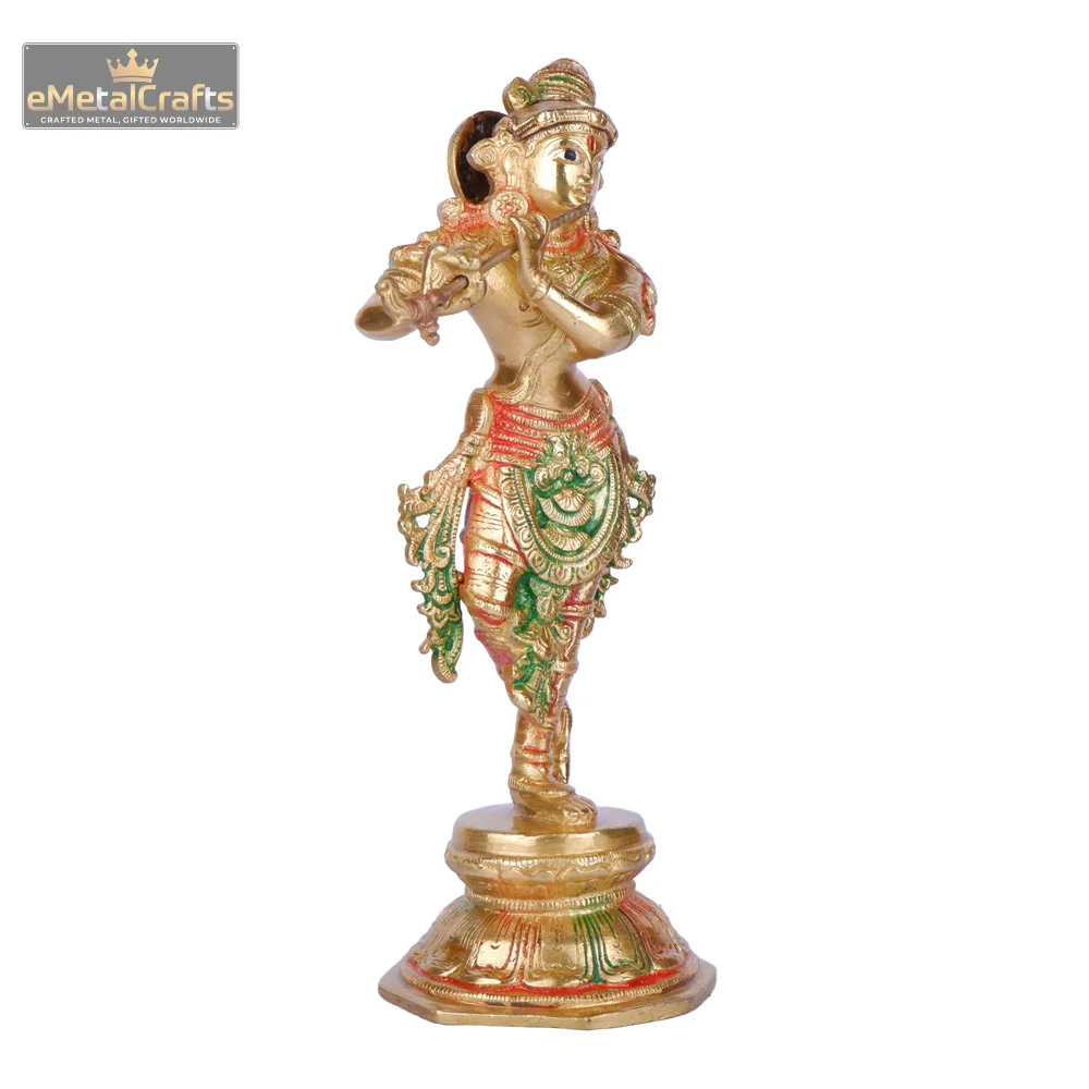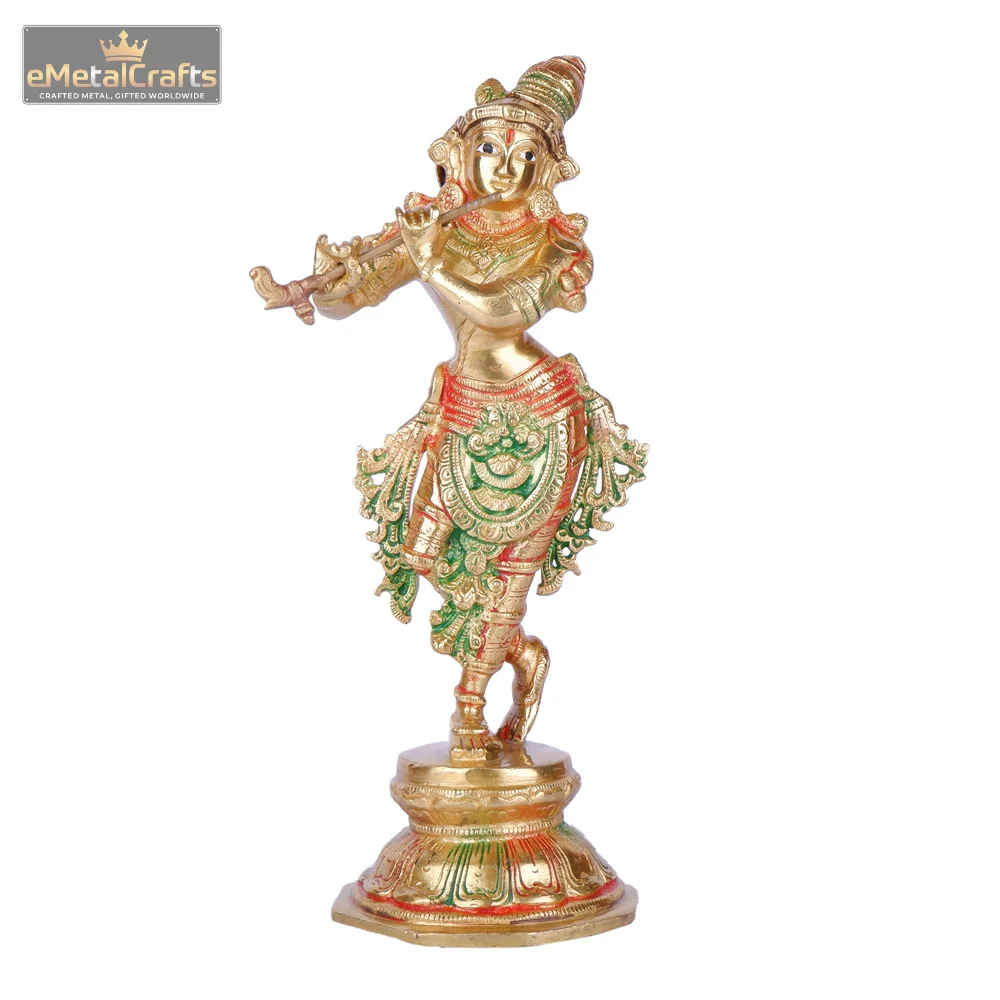 This elegant brass Lord Krishna sculpture in his quintessential standing pose, gracefully playing his divine flute. Every detail, from his ornate crown and flowing garments to the intricate design of the flute, is meticulously crafted, showcasing fine artistry. The gold finish lends a timeless and revered aura to the idol, highlighting the subtle textures and contours. This piece embodies the enchanting and blissful presence of Krishna, making it a perfect spiritual addition to your home altar, a charming decorative accent, or a thoughtful gift that brings peace and auspiciousness to any space.