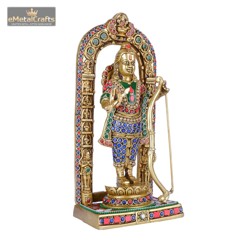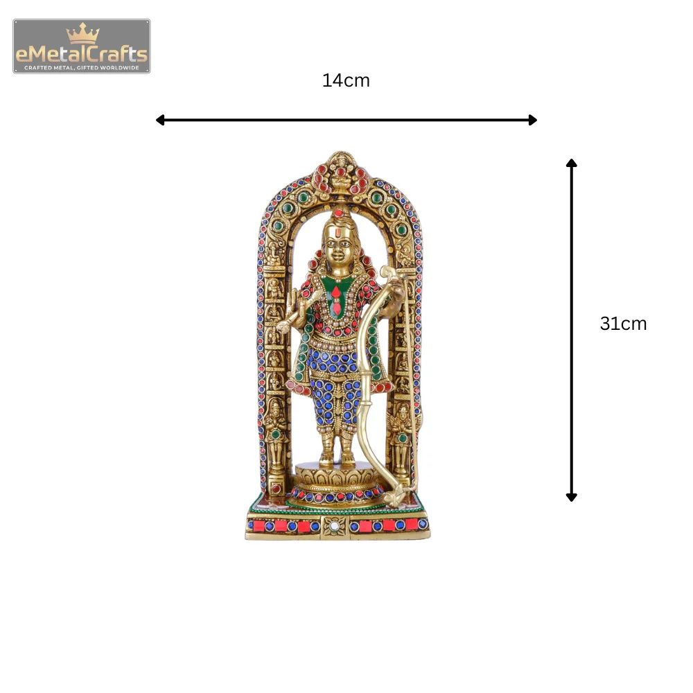 Gaze upon this resplendent brass sculpture of Lord Rama, a truly captivating depiction presented within an elaborately adorned arch (prabhavali). This finely crafted idol portrays the Lord standing with dignified poise, holding His sacred dhanush (bow) and an arrow, symbolizing righteousness and protection. What sets this piece apart are the vivid, multi-colored stone embellishments that brilliantly accentuate His ornate attire, crown, and chest plate. Pure Brass Lord Ram Idol the magnificent arch surrounding Him is also richly inlaid with these dazzling stones, creating a radiant halo effect. Supported by a sturdy, multi-tiered pedestal, similarly enhanced with colorful accents, this idol emanates a powerful and serene aura. With its golden finish, this substantial and aesthetically rich piece is superb for your spiritual space or home adornment, bestowing courage, virtue, and profound spiritual benefits.