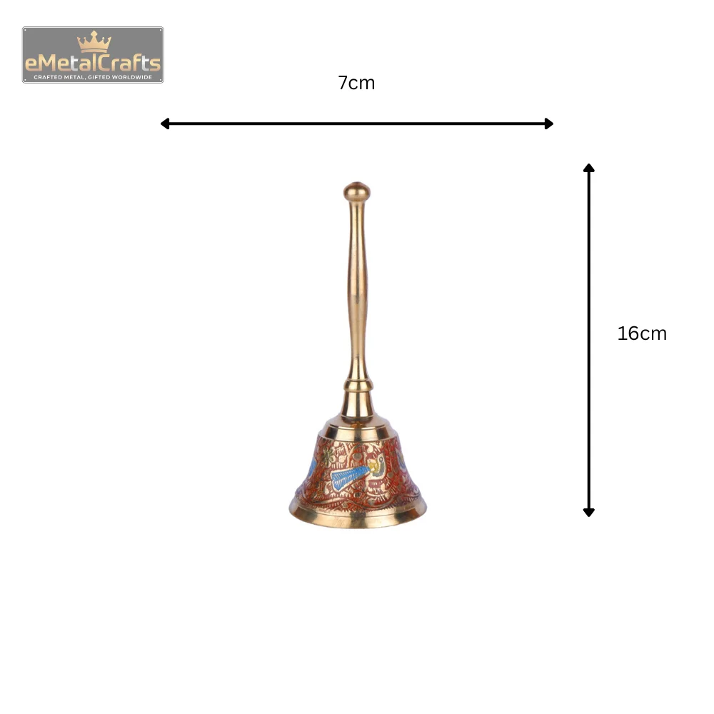 This beautifully crafted Brass made pooja bell for home temple for home temple is a striking blend of traditional design and vibrant artistry. Made from high-quality brass, its rich golden base is exquisitely adorned with intricate red enamel work, featuring delicate floral patterns and traditional motifs that enhance its aesthetic appeal. The brass made pooja bell for home temple well-proportioned handle leads down to the gracefully flared bell, designed to produce a clear, resonant, and melodious chime. This sound is believed to purify the atmosphere, dispel negative energies, and invite divine blessings during prayers and rituals. This hand bell is not only a functional item for your puja room or altar but also a stunning decorative piece that brings spiritual harmony and a touch of traditional Indian craftsmanship into any home or sacred space. It makes for a thoughtful and cherished gift for devotees, collectors, or anyone appreciating fine artisanal work.