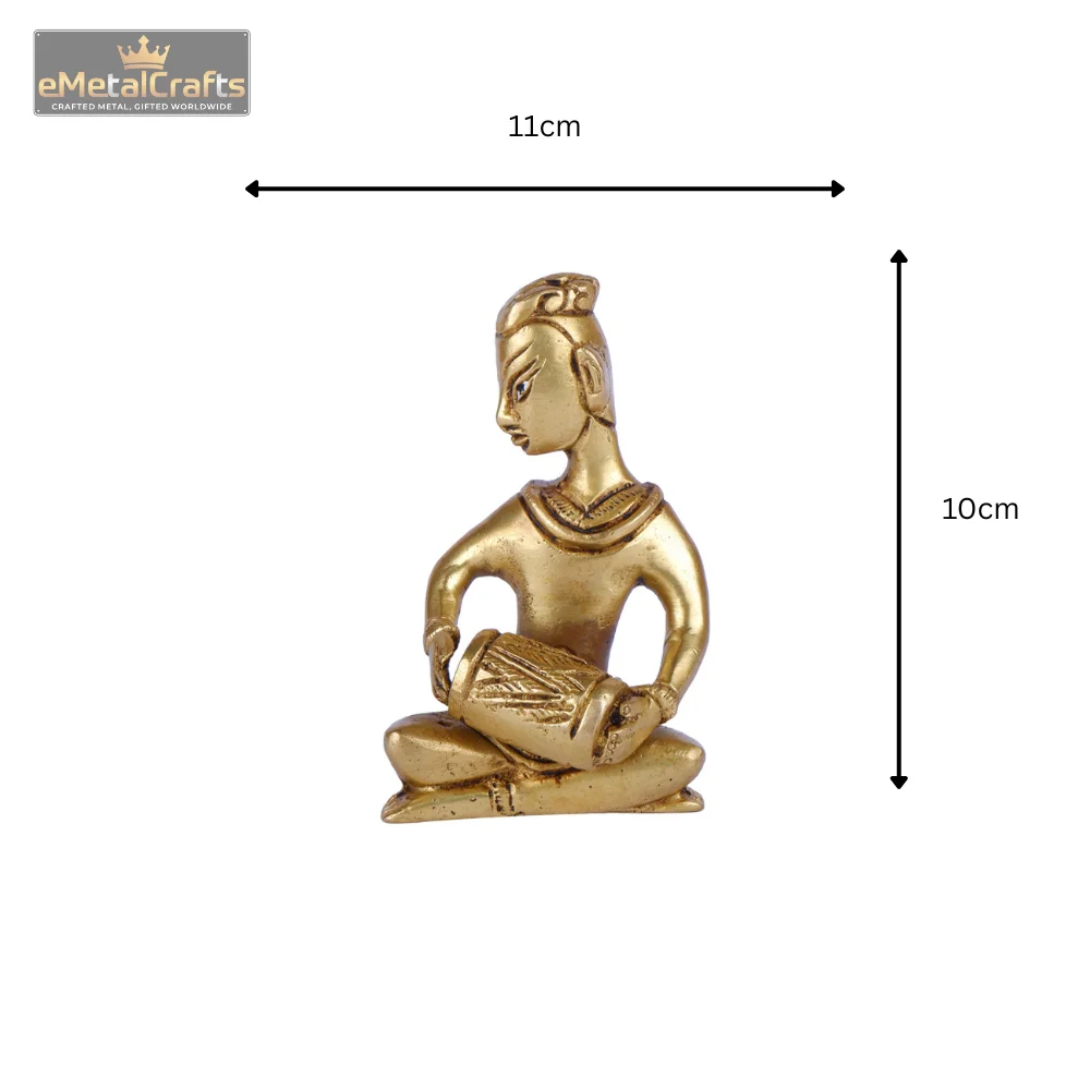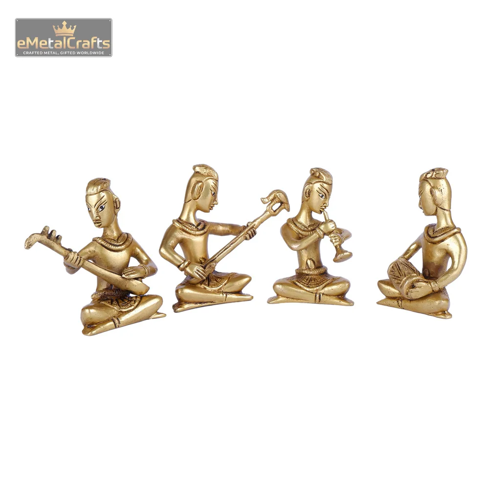 This is an exquisite set of four vintage brass music set Musician figurines, meticulously crafted to bring the rich heritage of Indian classical music into your home. Each golden-hued sculpture depicts a traditional Indian artist seated in a graceful, cross-legged posture, deeply engrossed in playing their respective instruments. The set showcases a harmonious ensemble, featuring musicians with a variety of instruments including a stringed instrument (like a Veena or Sitar), a percussion instrument (such as a Tabla or Mridangam), another unique stringed instrument (perhaps a Sarod or Tambura), and a wind instrument (a Flute or Shehnai). The aged patina of the brass adds to their vintage charm, making them perfect for adding a touch of cultural elegance and artistic sophistication to any living space, music room, or study. These pieces serve not just as decor, but as a silent ode to the timeless melodies of India.