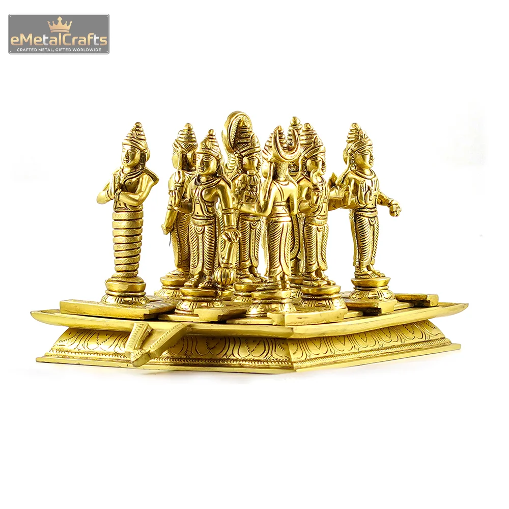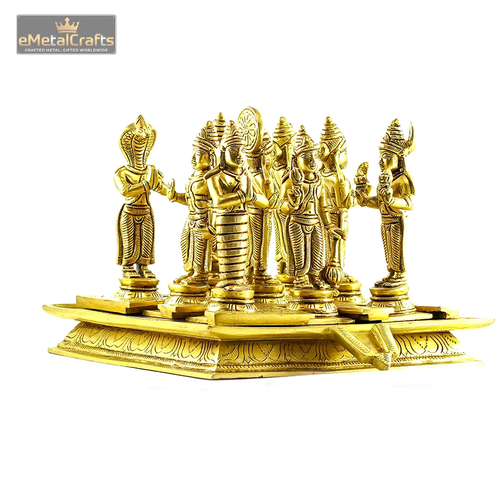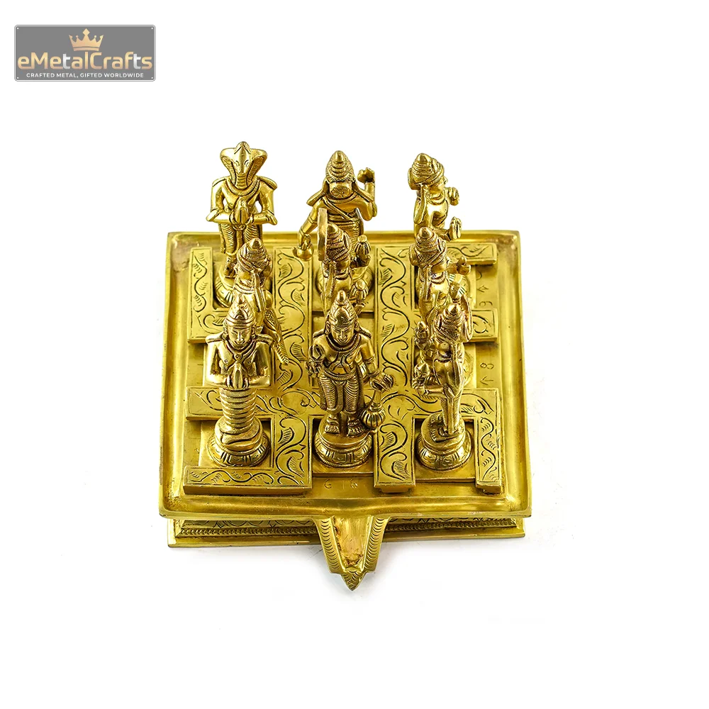 Rooted in ancient Vedic tradition, this stunning Brass Navagraha Statue Deity Set brings together the nine planetary gods in a single, sacred display. Expertly crafted in gleaming brass, each figure is rich in detail and symbolism, arranged on an intricately designed pedestal that enhances its spiritual presence. The Navagrahas are believed to influence destiny, emotions, and energies—making this set a powerful addition to your prayer room, meditation area, or sacred altar. Whether for daily worship or as a statement of cultural heritage, this piece offers both divine grace and artistic elegance.