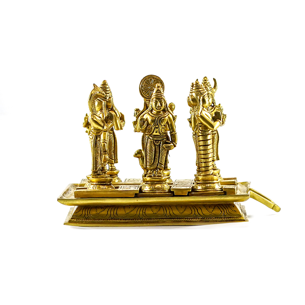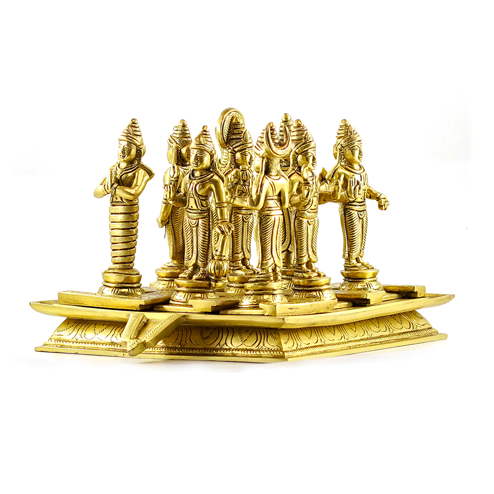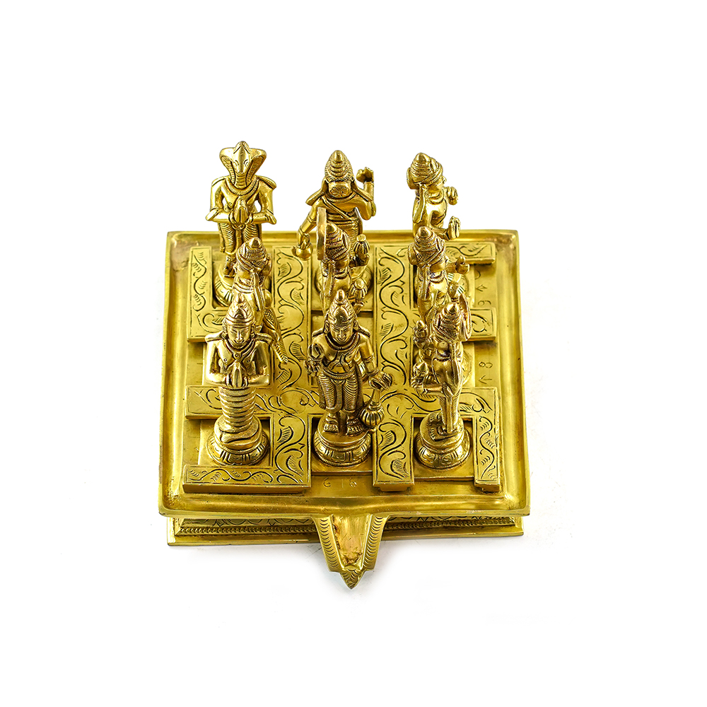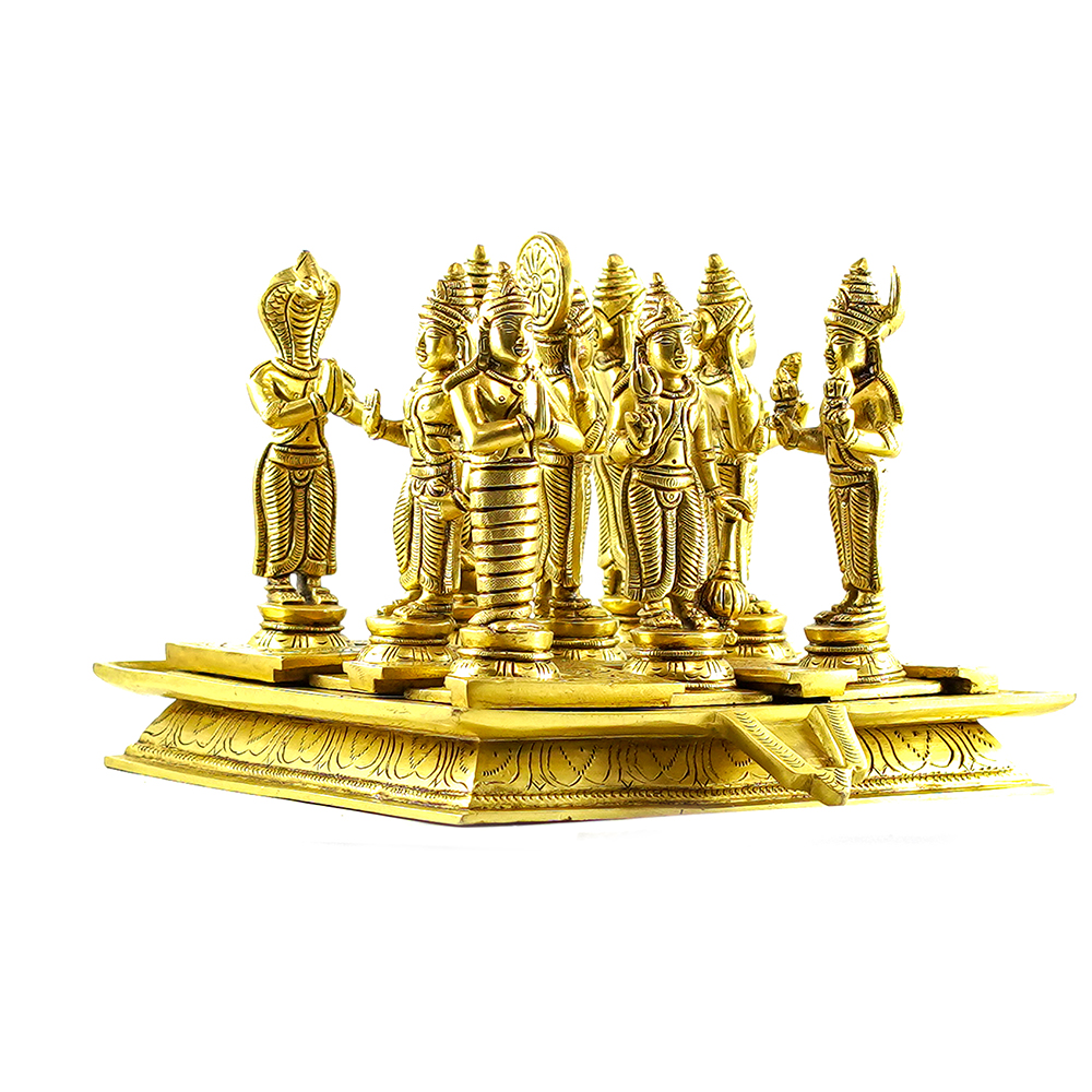 Rooted in ancient Vedic tradition, this stunning Brass Navagraha Statue Deity Set brings together the nine planetary gods in a single, sacred display. Expertly crafted in gleaming brass, each figure is rich in detail and symbolism, arranged on an intricately designed pedestal that enhances its spiritual presence. The Navagrahas are believed to influence destiny, emotions, and energies—making this set a powerful addition to your prayer room, meditation area, or sacred altar. Whether for daily worship or as a statement of cultural heritage, this piece offers both divine grace and artistic elegance.
