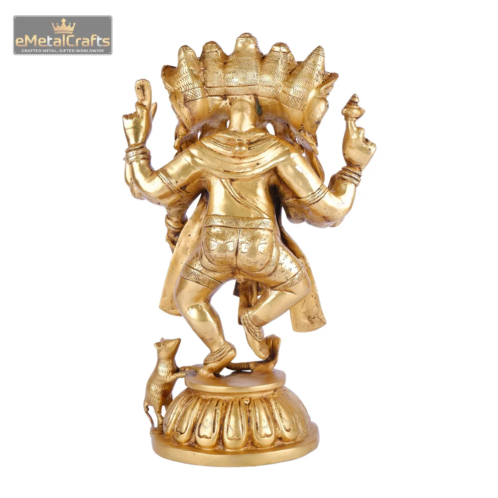 This exquisite brass idol of five-headed dancing Brass Panchamukhi Ganesha, with multiple arms and intricate detailing, radiates divine energy and spiritual strength, making it a striking centerpiece for any sacred space.