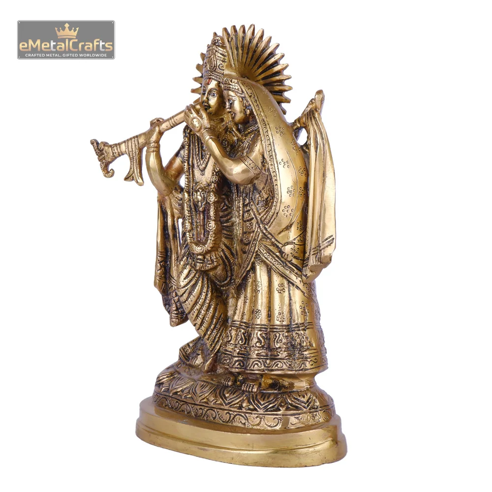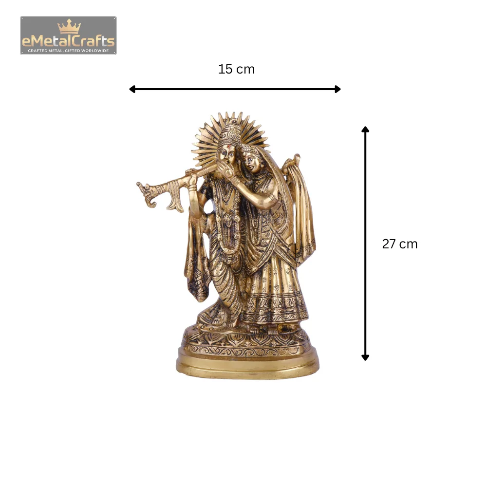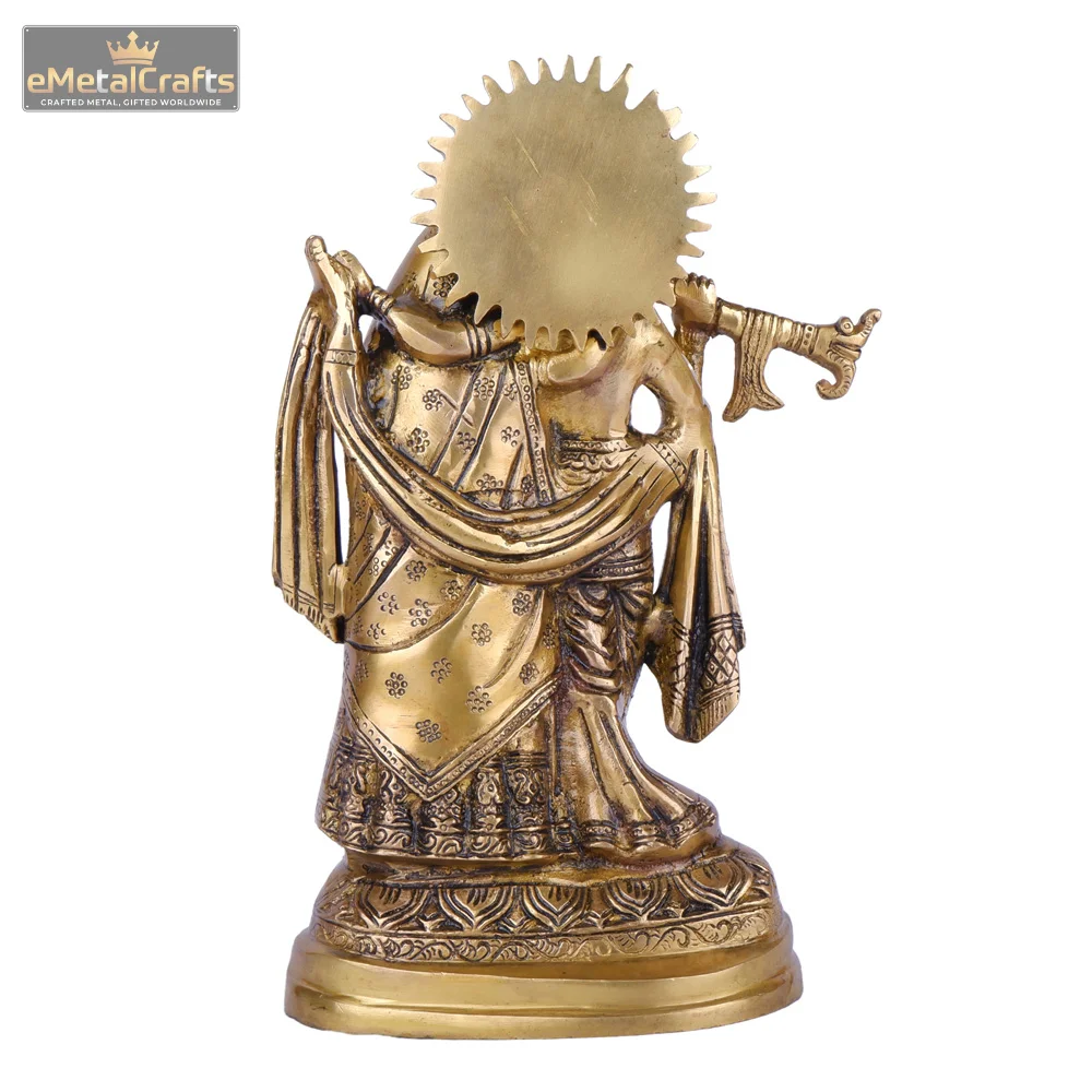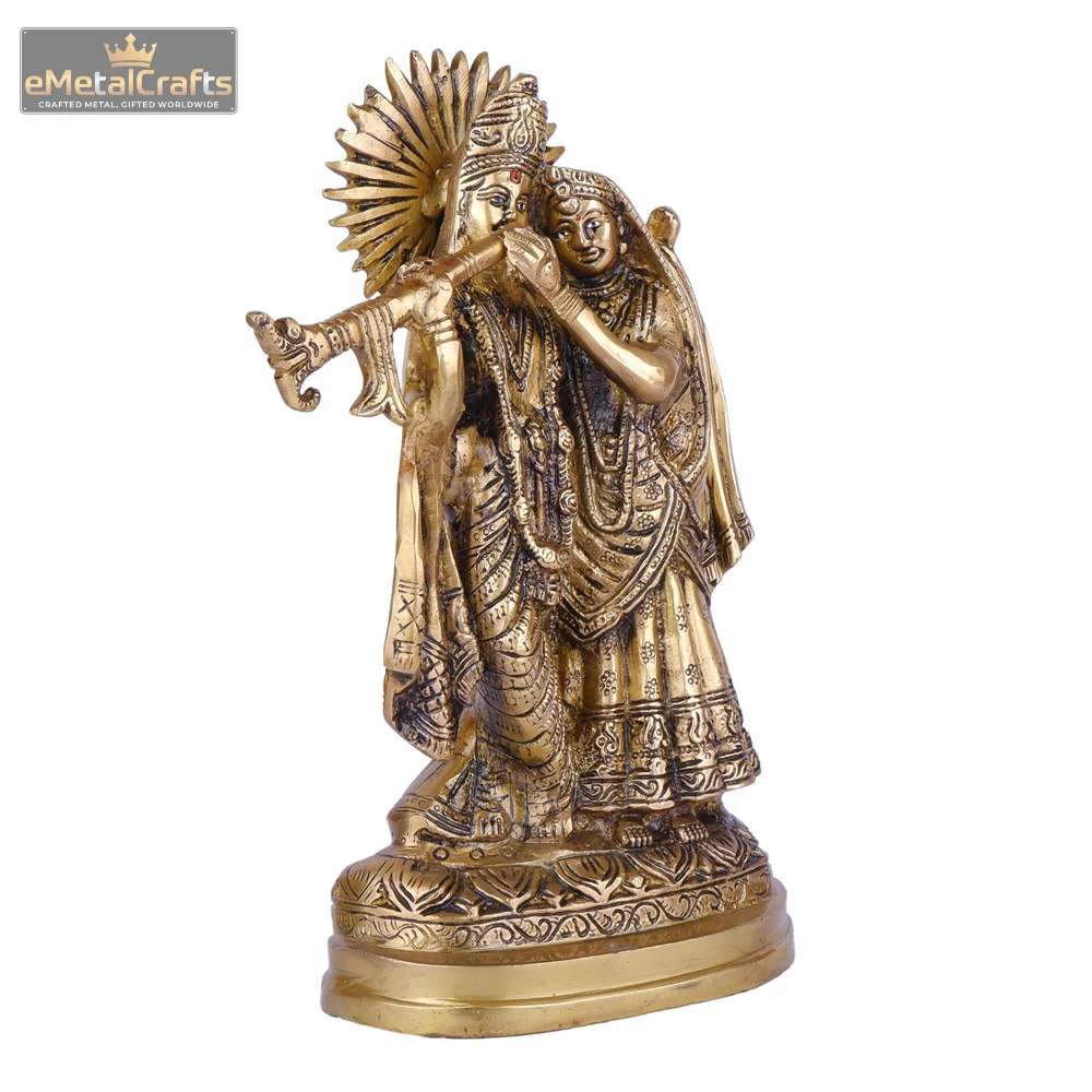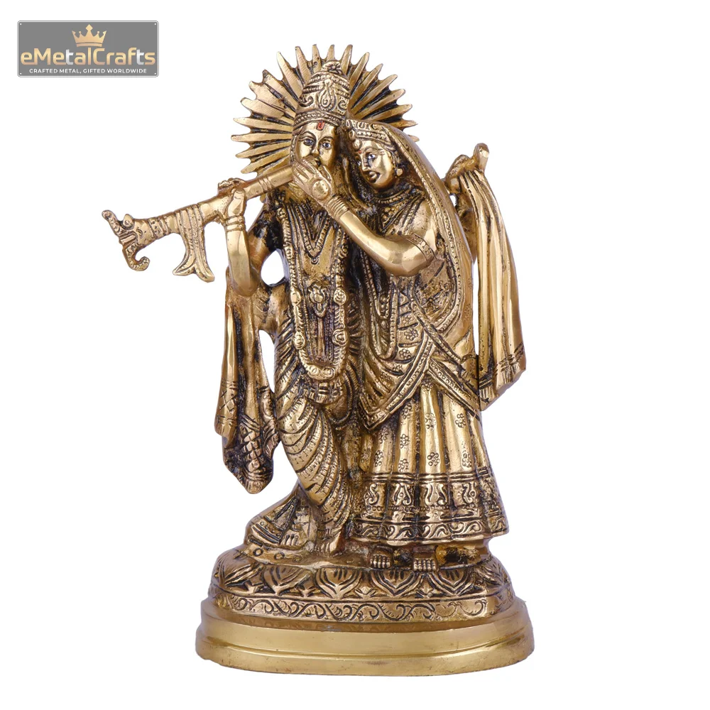This magnificent beautifully captures the eternal love and divine connection of brass Radha Krishna Murti . Krishna is depicted in his iconic pose, playing the enchanting flute, while Radha stands gracefully by his side, both figures exuding an aura of spiritual serenity. The detailed craftsmanship is evident in their intricate attire, ornaments, and Krishna’s stylized halo (or prabhāvalī) behind his head. The classic gold finish highlights every fine detail, making this a powerful symbol of pure love, devotion, and harmony. This grand piece is an ideal addition to your home altar, a revered collectible, or a truly special gift that emanates peace and auspiciousness.