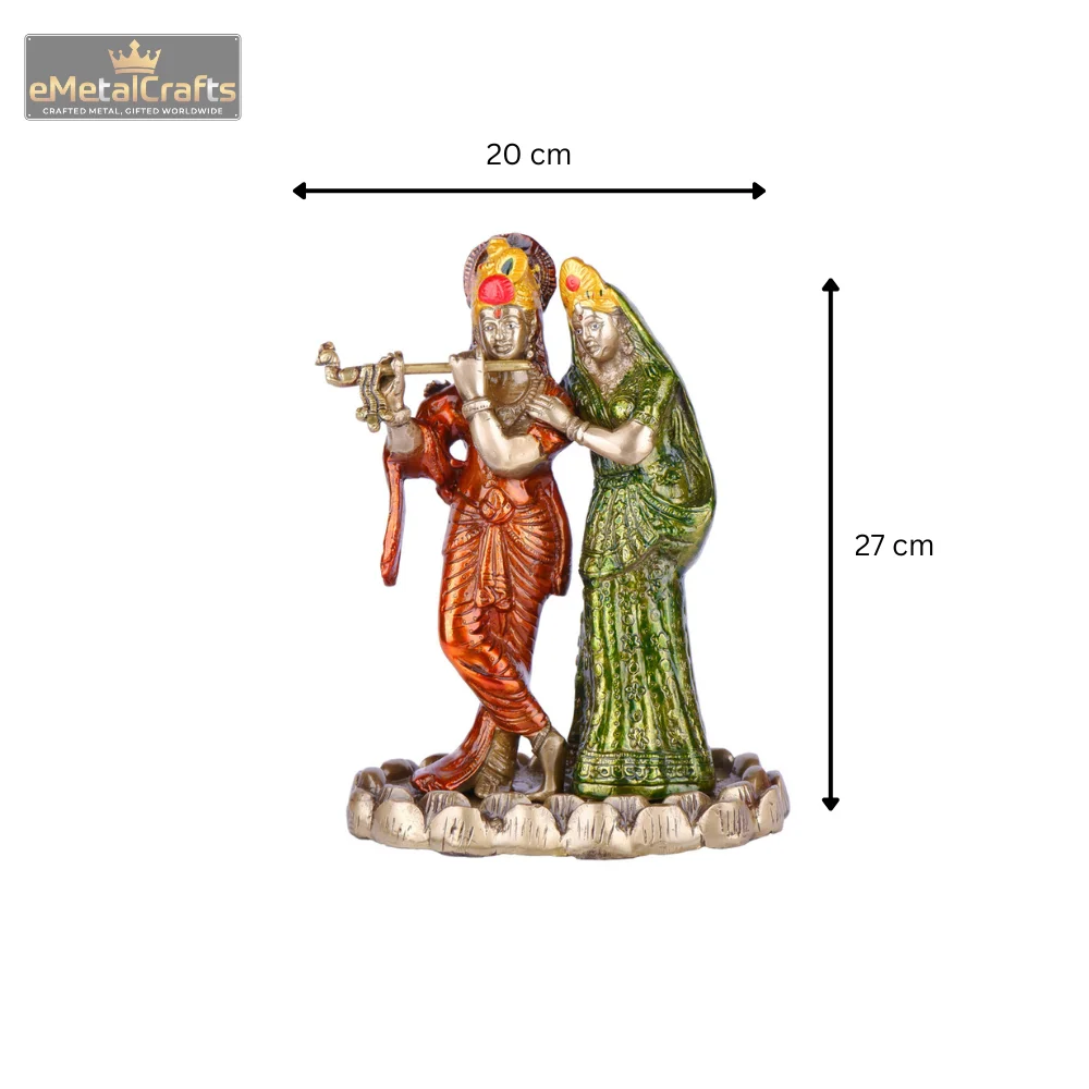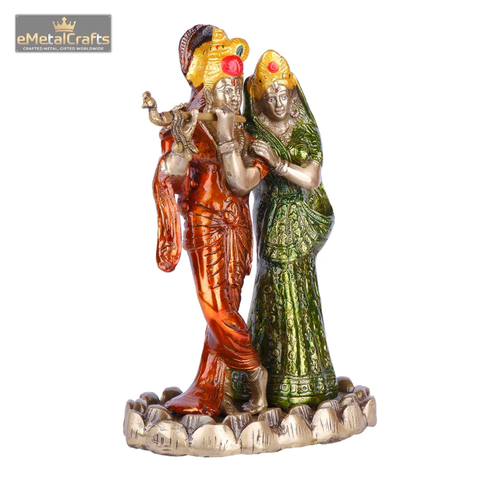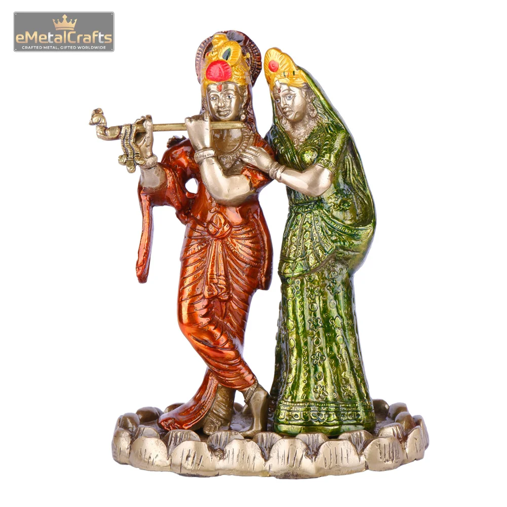 This captivating beautifully portrays the divine love of brass Radha Krishna Sculpture. Lord Krishna, holding his melodious flute, is depicted in a striking coppery-gold finish, while Radha stands gracefully beside him in an enchanting antique green finish. The intricate details on their attire, ornaments, and the lotus-petal inspired base are highlighted by this unique dual-tone coloring, making the idol visually distinctive and spiritually resonant. This exquisite piece symbolizes eternal love, harmony, and devotion, serving as a perfect spiritual accent for your home, a cherished collectible, or a thoughtful gift for auspicious occasions.