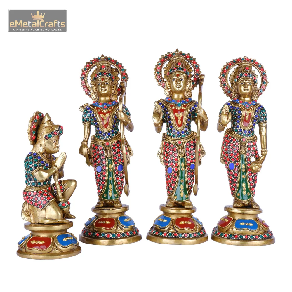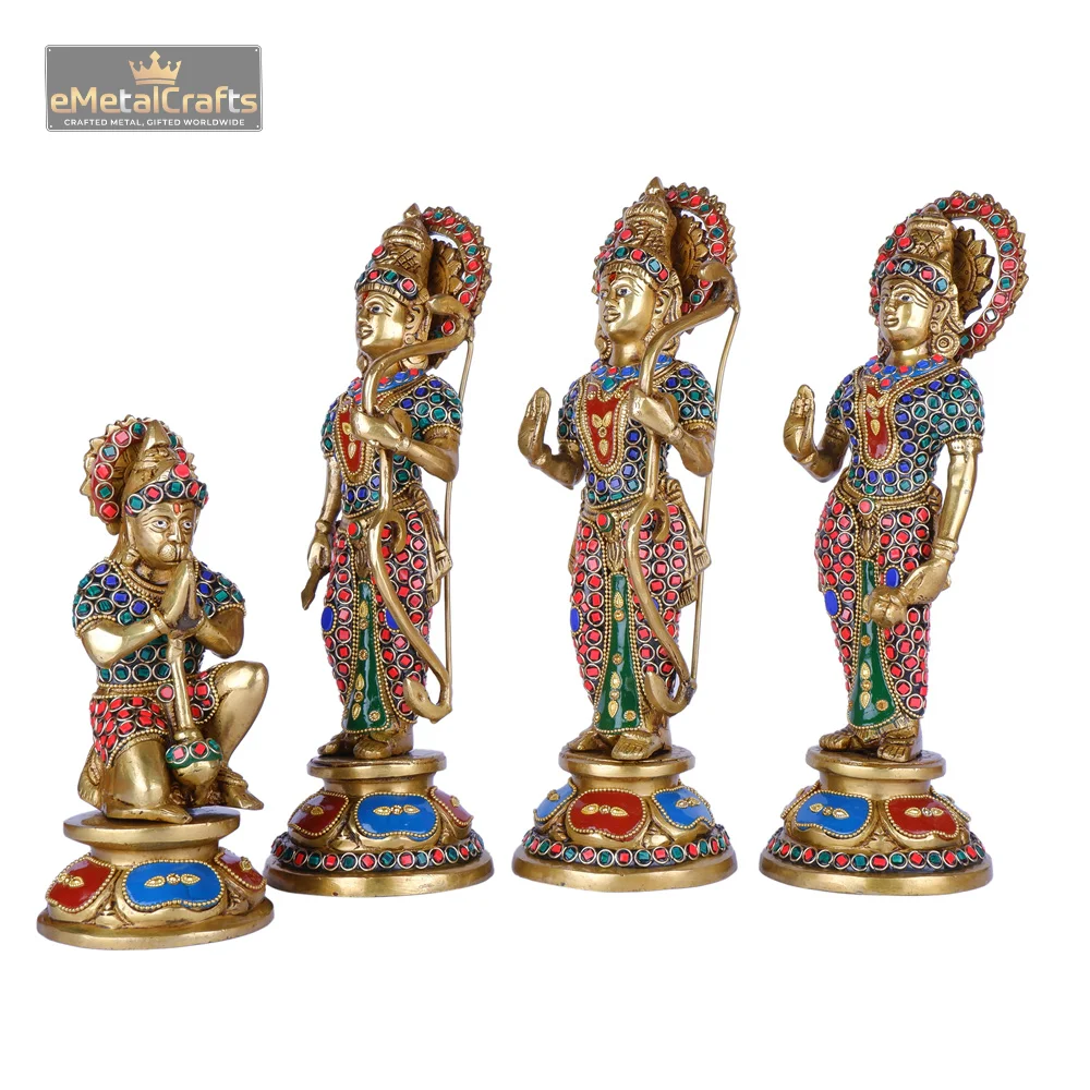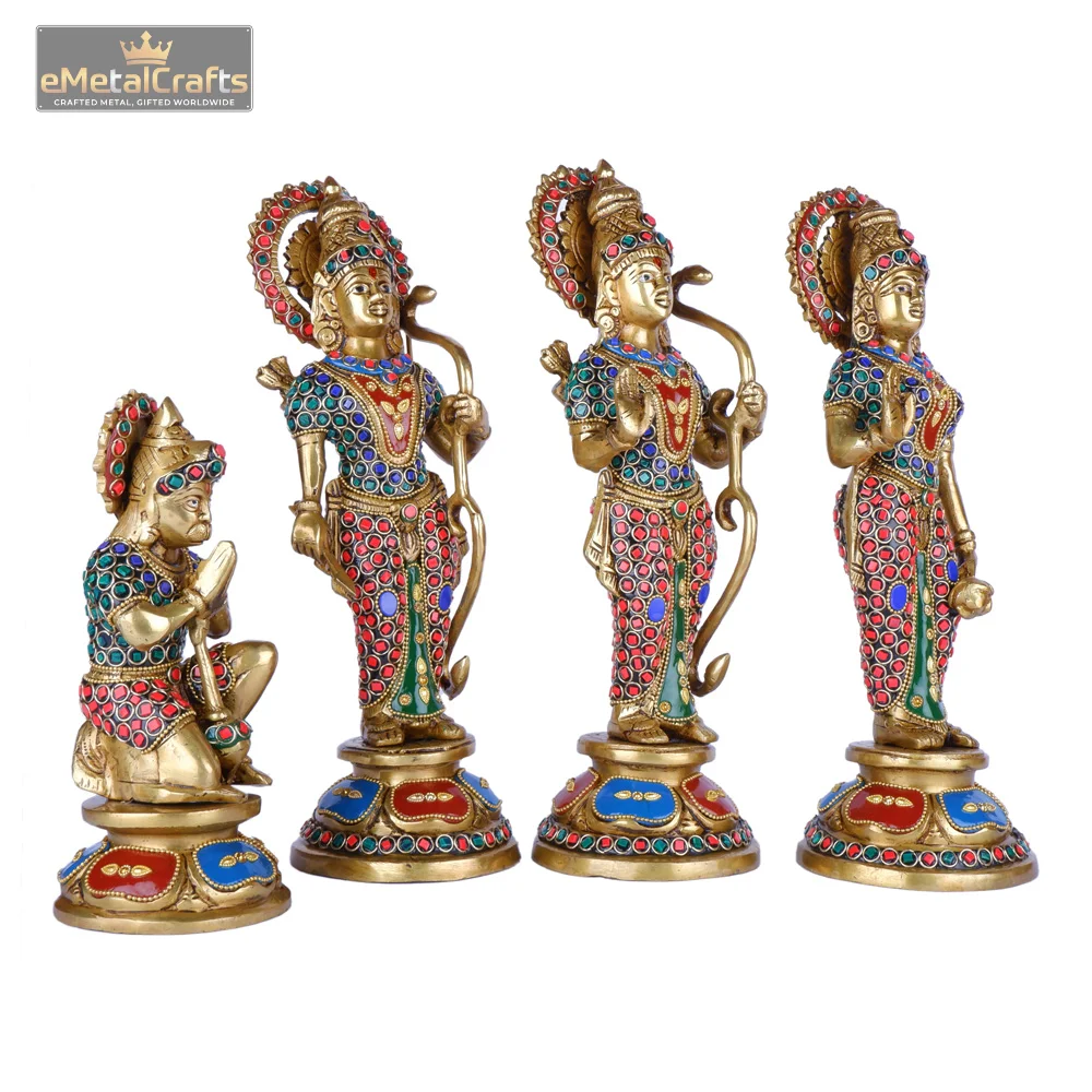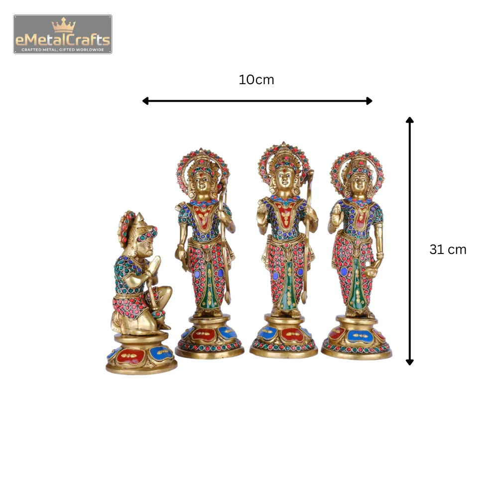 This magnificent brass Ram Darbar idol , featuring Lord Rama, Goddess Sita, and Lord Lakshmana standing gracefully, accompanied by devoted Lord Hanuman in a kneeling posture. Each figure is meticulously adorned with intricate carvings and vibrant multicolored stone embellishments, reflecting exquisite craftsmanship and divine elegance. The rich gold finish combined with the colorful detailing enhances its regal charm, making it a perfect centerpiece for pooja rooms, spiritual décor, or as an auspicious gift symbolizing devotion, righteousness, and blessings.