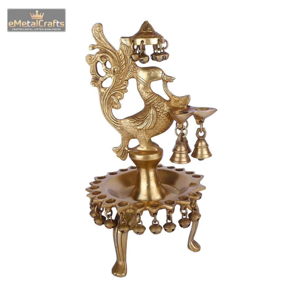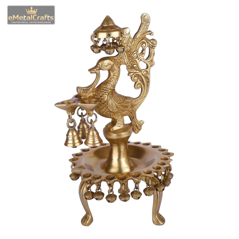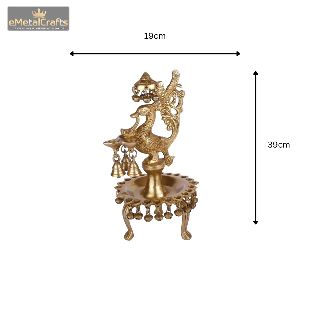 This exquisite brass diya masterfully blends traditional symbolism with functional design, featuring a majestic brass deepak decorated peacock shape perched elegantly at its center. The peacock, a symbol of beauty, grace, and prosperity, is intricately detailed with ornate feathers. From its beak, a smaller diya cup gracefully extends, ready for illumination. Below the peacock, a circular tray with multiple small diya holders is positioned to amplify the lamp’s glow. Adding to its charm and spiritual significance, several delicate brass bells hang from both the peacock’s structure and the base, designed to produce a gentle, soothing chime. Brass deepak decorated peacock shape crafted from premium quality brass with a rich golden finish, this elaborate diya is perfect for spiritual rituals, festive celebrations, or as a stunning decorative centerpiece in your home. It promises to bring an aura of serenity, auspiciousness, and traditional elegance to any space.