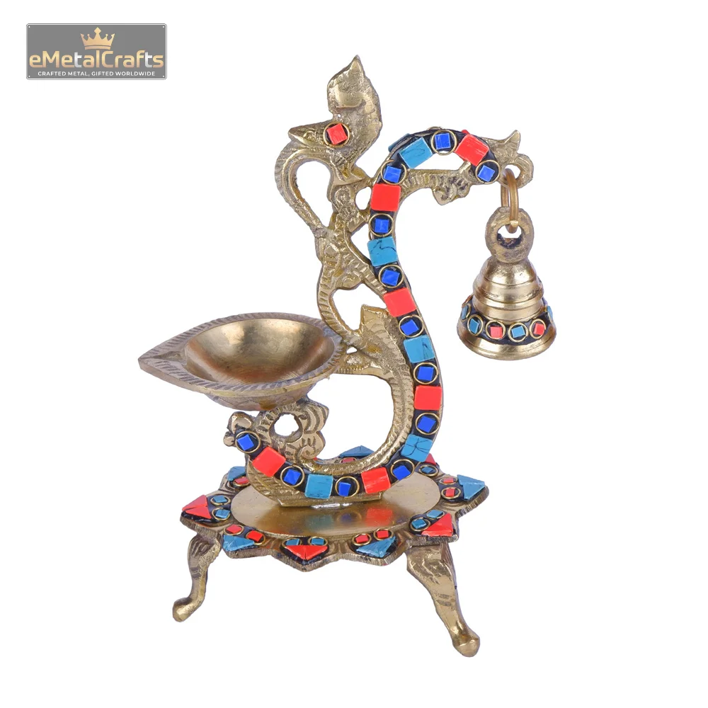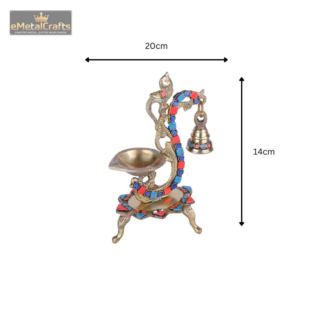 This elegant brass stone peacock diya (oil lamp) combines functionality with traditional aesthetics, featuring a beautifully crafted single lamp holder alongside an ornate stand from which a small bell gracefully hangs. The entire piece is embellished with colorful stone or enamel work in blue, red, and gold tones, adding a vibrant and festive touch. The intricate design of the stand and base showcases traditional Indian artistry. This diya is perfect for daily prayers, festive occasions, or as a charming decorative accent, bringing both light and the auspicious sound of the bell to your home or sacred space.