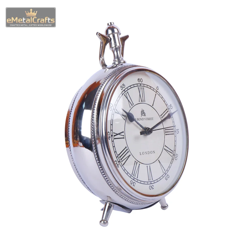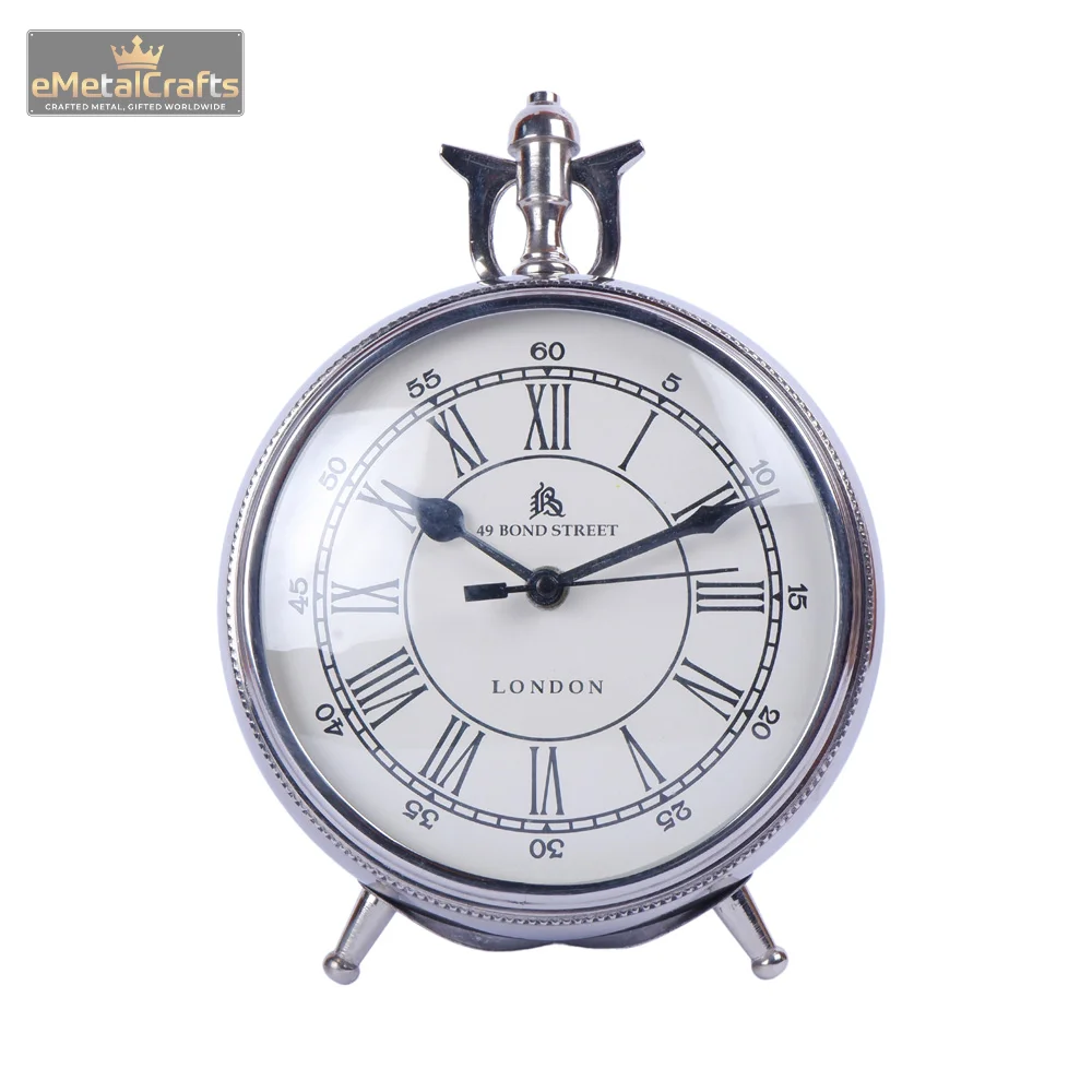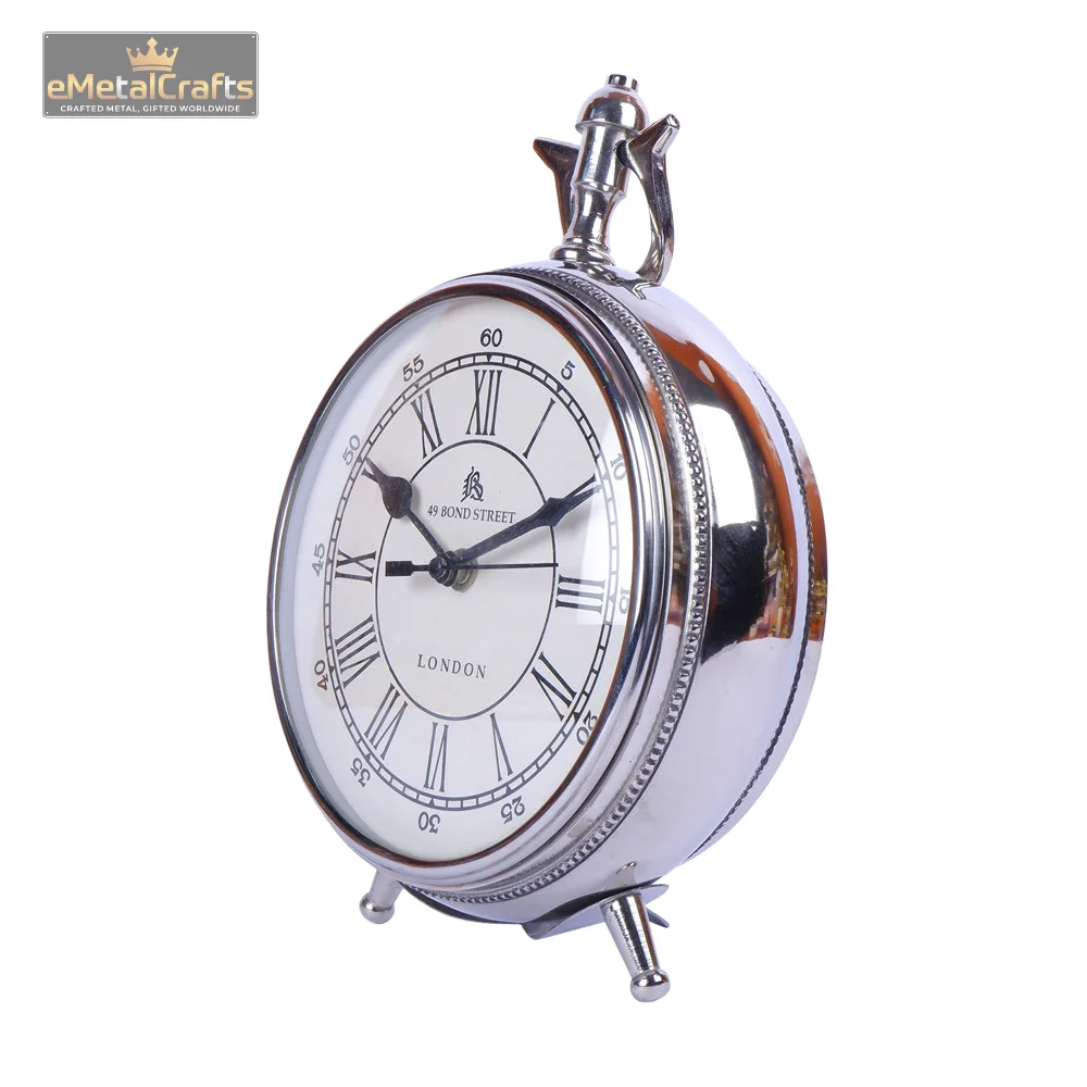 This elegant vintage-Almunium stylish clock for table features bold Roman numerals on a crisp white dial, encased in a silver-colored metal frame with a classic design. The clock is supported by a sturdy tripod stand, adding a timeless touch. Ideal for enhancing the aesthetic of office desks, bookshelves, or study corners.