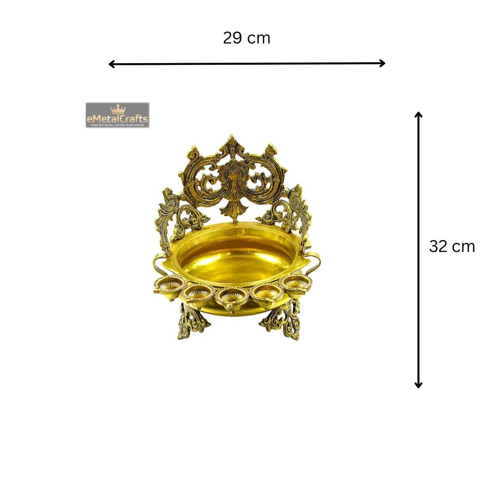 This magnificent, multifunctional piece is a fusion of a Brass Urli Bowl and a five-wick oil lamp (diya), crafted for deep ceremonial use and striking display. Made from solid brass, the expansive, round basin is supported by a highly detailed, ornamental backrest and base. Integrated seamlessly around the lower edge are five separate diya cups, transforming the piece into an impressive Panch-mukhi lamp that casts a beautiful glow. The entire Urli maintains a classic, bright golden brass finish, which beautifully highlights the intricate traditional scrollwork. This substantial item is perfect for sacred rituals, for floating flowers in the central basin, or for creating a powerful, luminous focal point in any home during festivals.