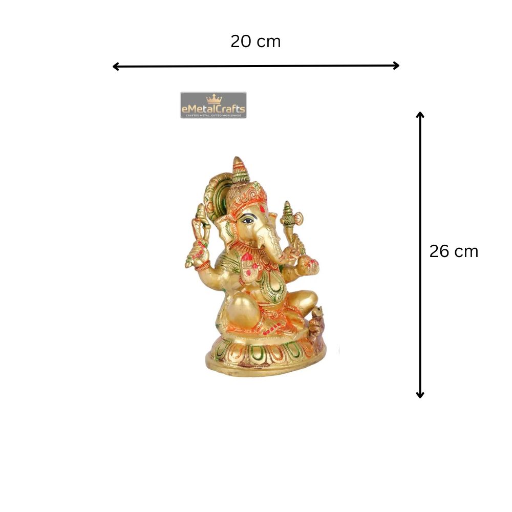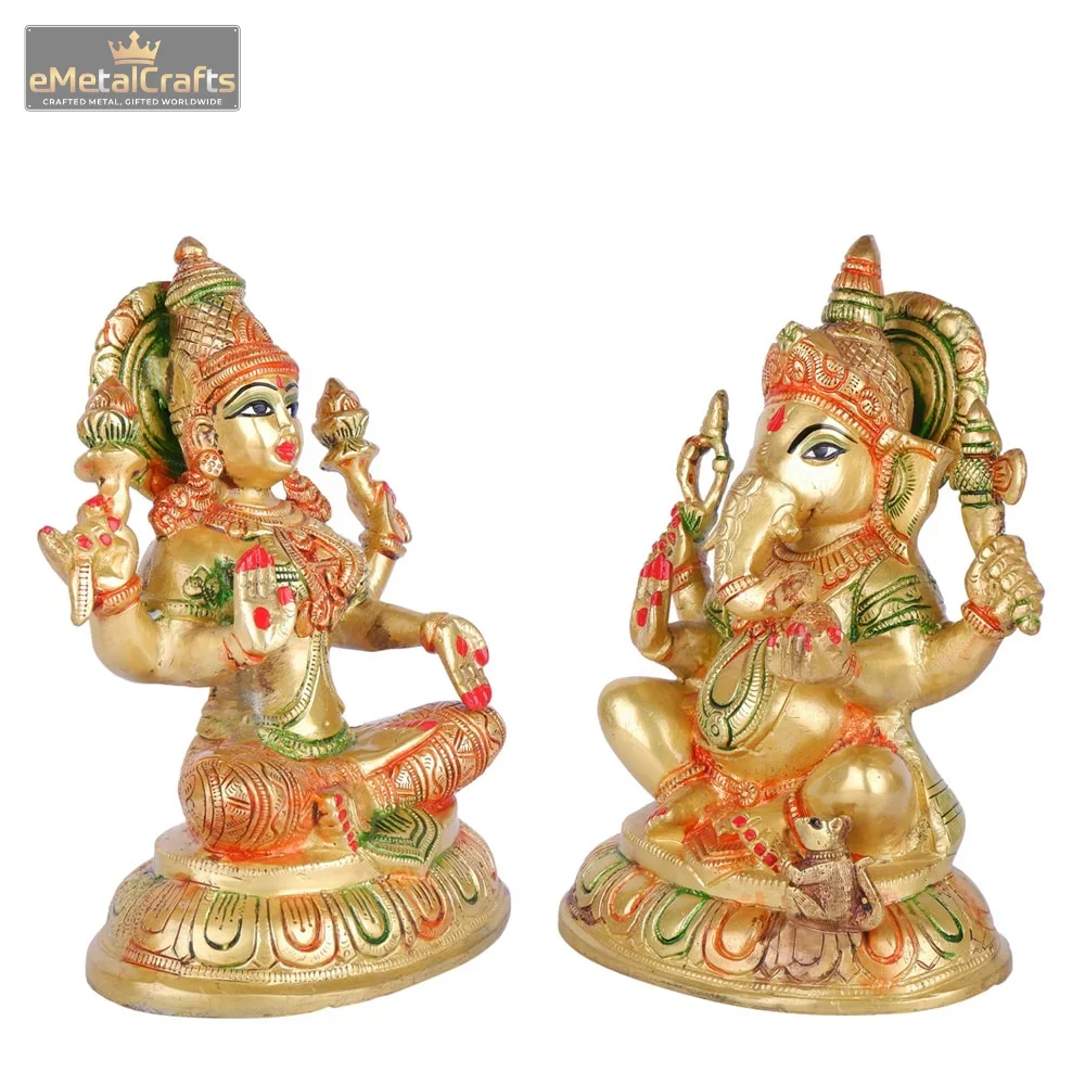 The pure brass ganesh laxmi idol, equally captivating, is depicted in his classic seated form with a golden finish enriched by hand-painted details in red, green, and gold. His benevolent gaze, adorned with a tilak, radiates wisdom, while his loyal mouse mount rests at his feet. The multi-colored highlights on his attire and jewelry bring out the artistry and vibrancy of the idol.
