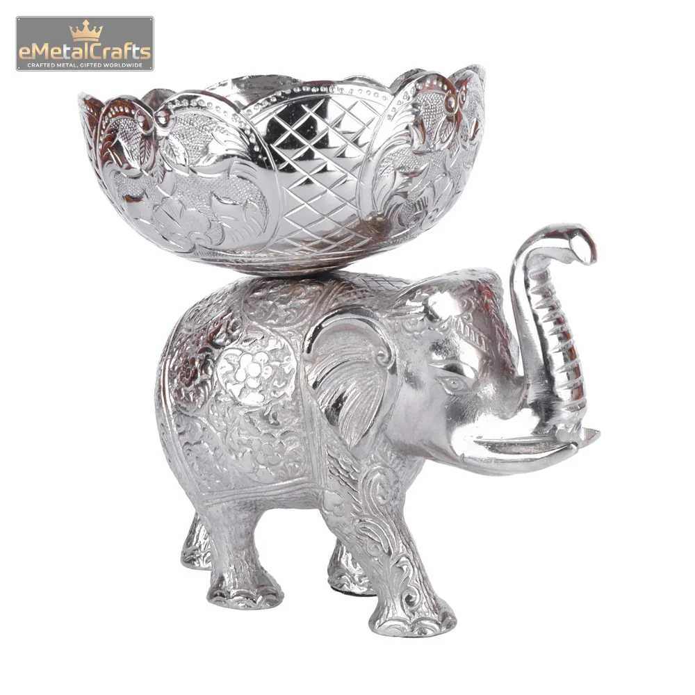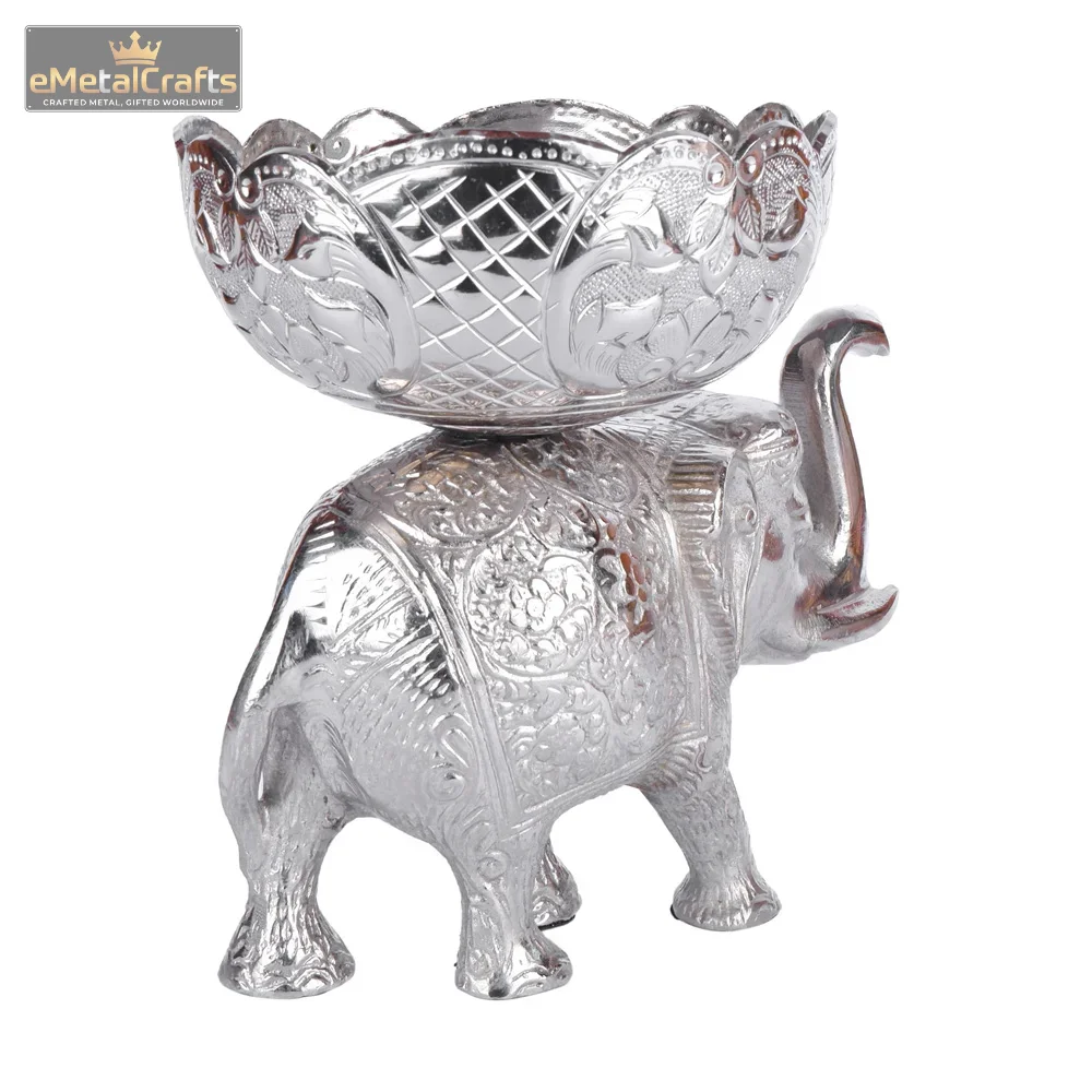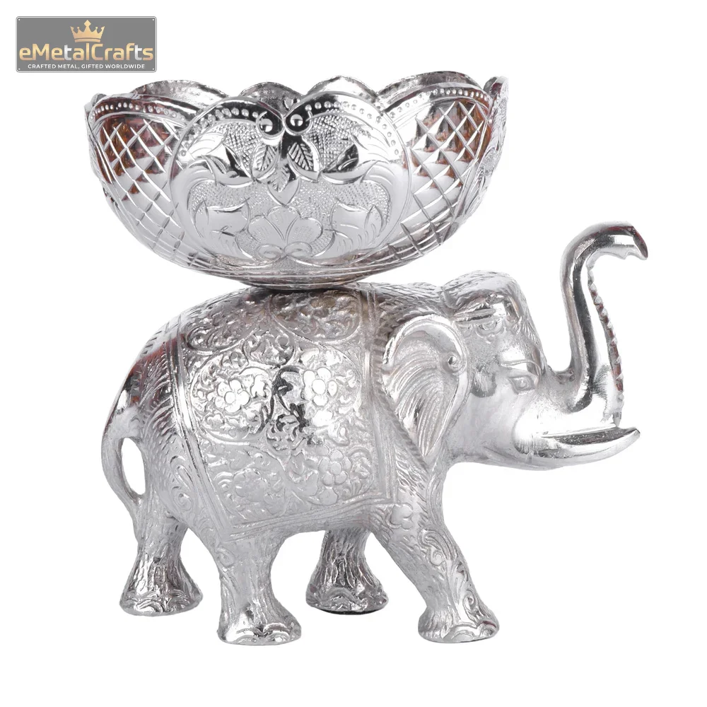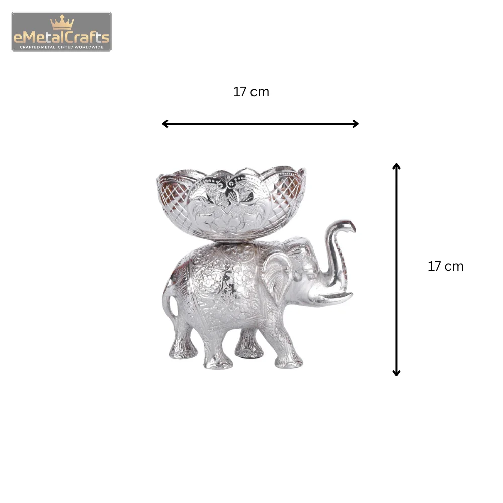 Add a touch of regal elegance to your home with this exquisite ornate aluminium dry fruit elephant bowl. This beautifully crafted piece features a majestic elephant figure, intricately detailed with textured skin and traditional patterns, serving as a sturdy base. Perched gracefully on its back is a decorative bowl, designed with elaborate floral motifs and a unique cross-hatch pattern on its rim, perfect for serving dry fruits, candies, or simply as a stunning decorative accent. The radiant silver plating gives it a luxurious and timeless appeal, making it an ideal centerpiece for festive occasions, special gatherings, or as a thoughtful gift.