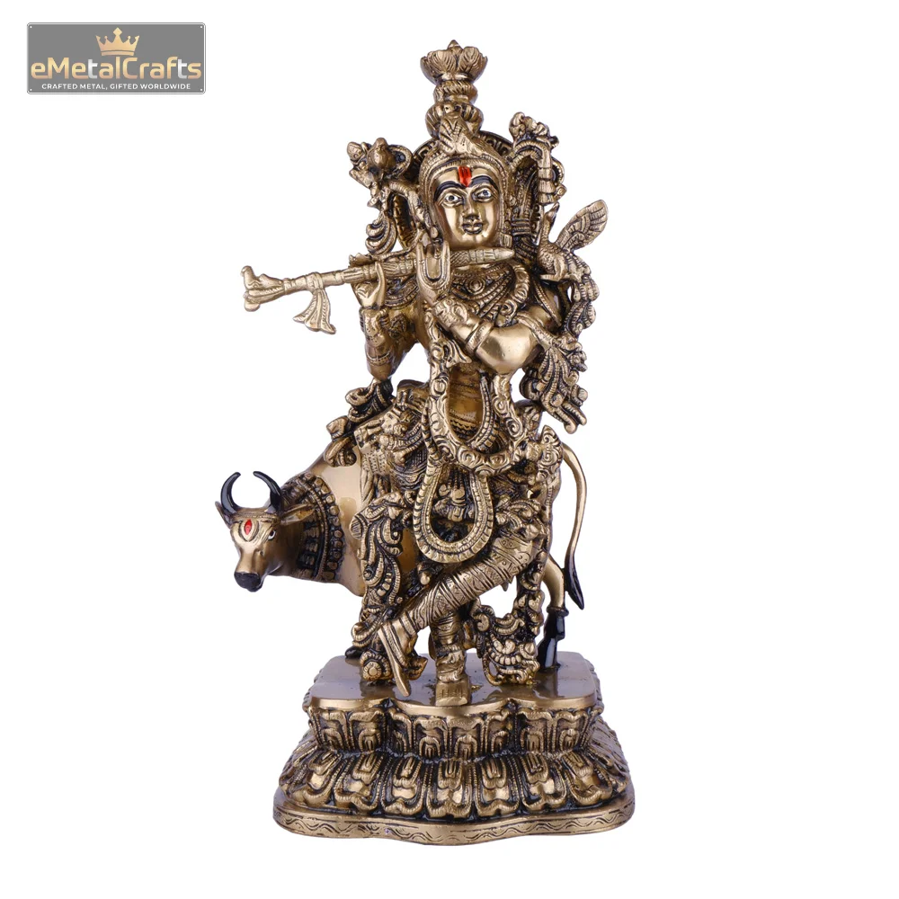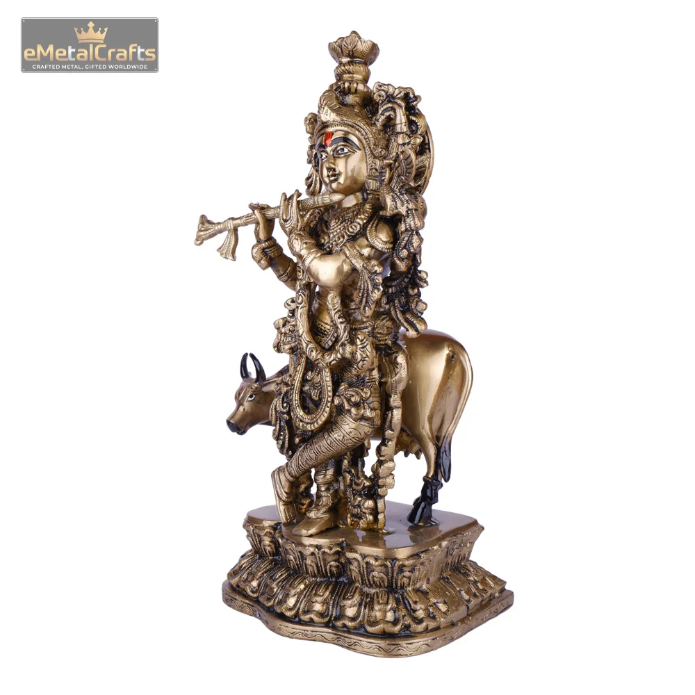 This magnificent brass Lord krishna ji with cow statue features, the divine flutist, standing gracefully atop a sacred cow. The idol is rendered in a rich gold finish, highlighting the intricate details of Krishna’s elaborate crown, ornaments, and the detailed textures of the cow. The cow’s eyes are subtly accented, adding to the charm of the piece. This captivating idol symbolizes prosperity, devotion, and the nurturing aspect of Krishna, making it a perfect addition to any spiritual decor, a cherished collectible, or a distinctive gift that brings peace and auspiciousness to your space.