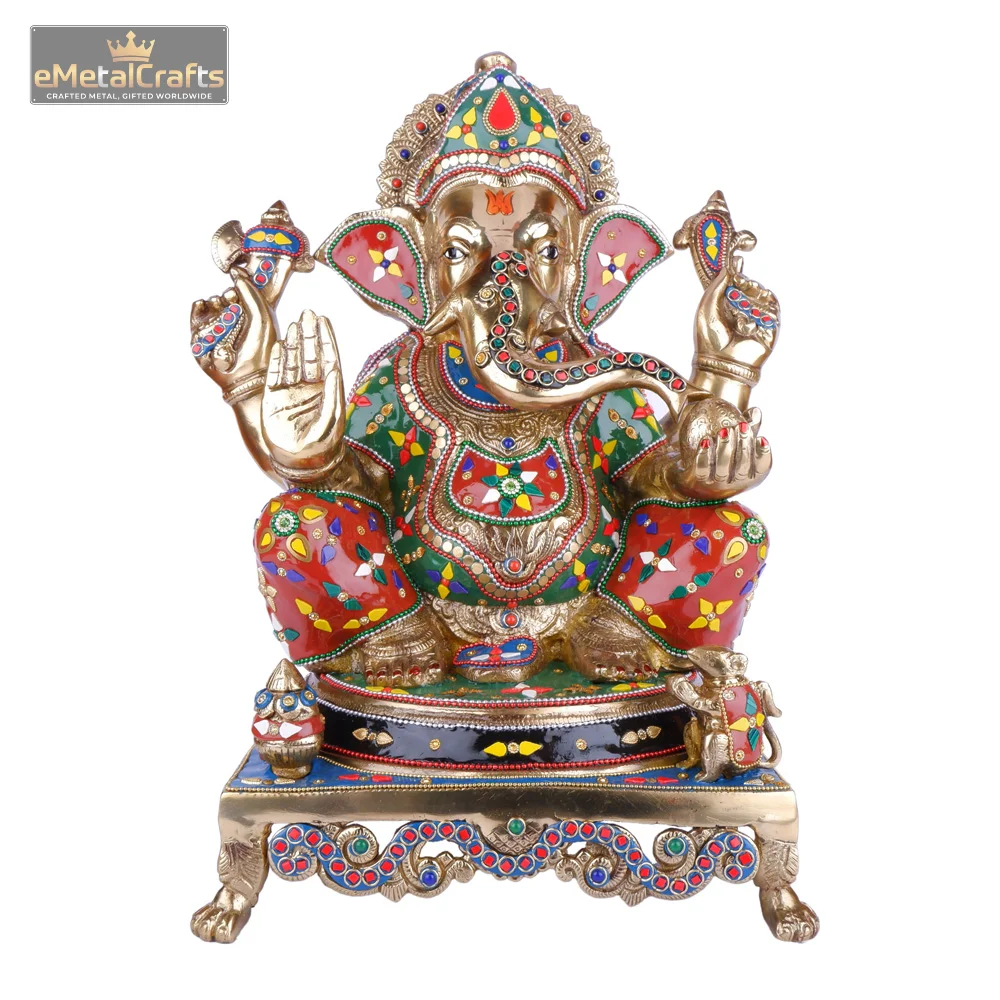 Experience the grandeur of divine art with this magnificent Lord Ganesha idol, an embodiment of vibrant devotion and meticulous craftsmanship. This substantial statue features Lord Ganesha in a traditional seated posture, richly adorned with intricate Meenakari (enamel) work in a dazzling array of colors including red, blue, green, and gold, enhanced by subtle jewel-like embellishments. His regal crown, elaborate jewelry, and flowing garments are all exquisitely detailed. The idol sits upon an elevated, multi-tiered rectangular base, also beautifully decorated with coordinated enamel patterns. This piece stands as a stunning testament to traditional Indian artistry, making it an awe-inspiring centerpiece for your sacred space, a revered temple addition, or a truly memorable gift.