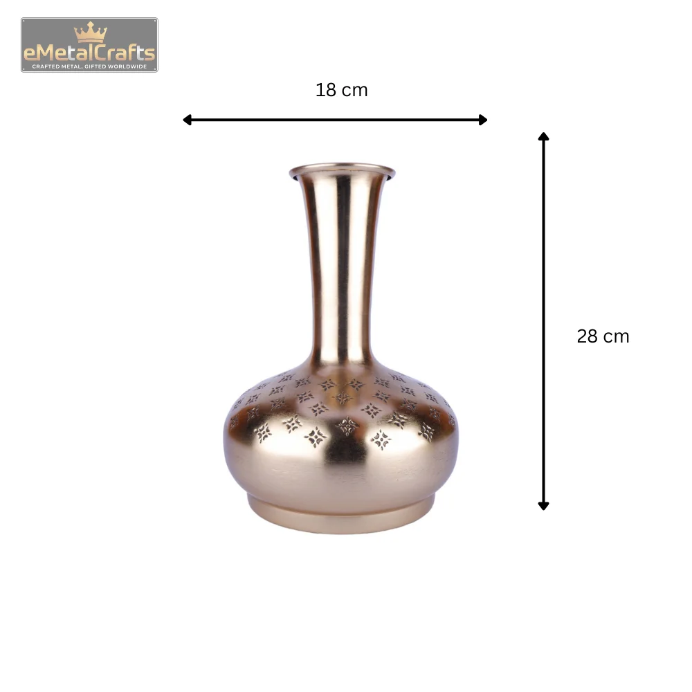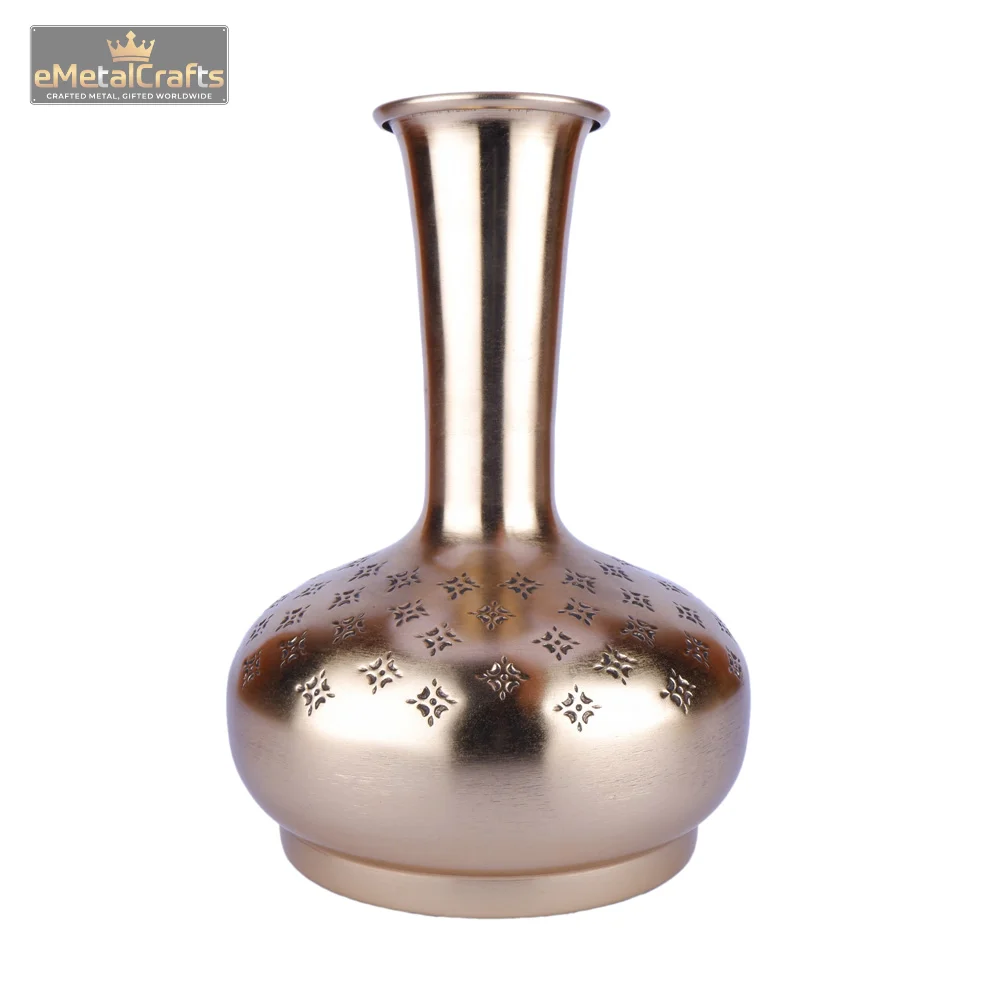 A graceful Aluminium Flower Pots with a long neck and broad base, designed to enhance your home décor with a touch of elegance. The gold finish and intricate floral motifs give it a rich, traditional look. Perfect as a standalone piece or to hold fresh or dried flowers, this vase brings beauty and charm to any setting—living room, hallway, or office.