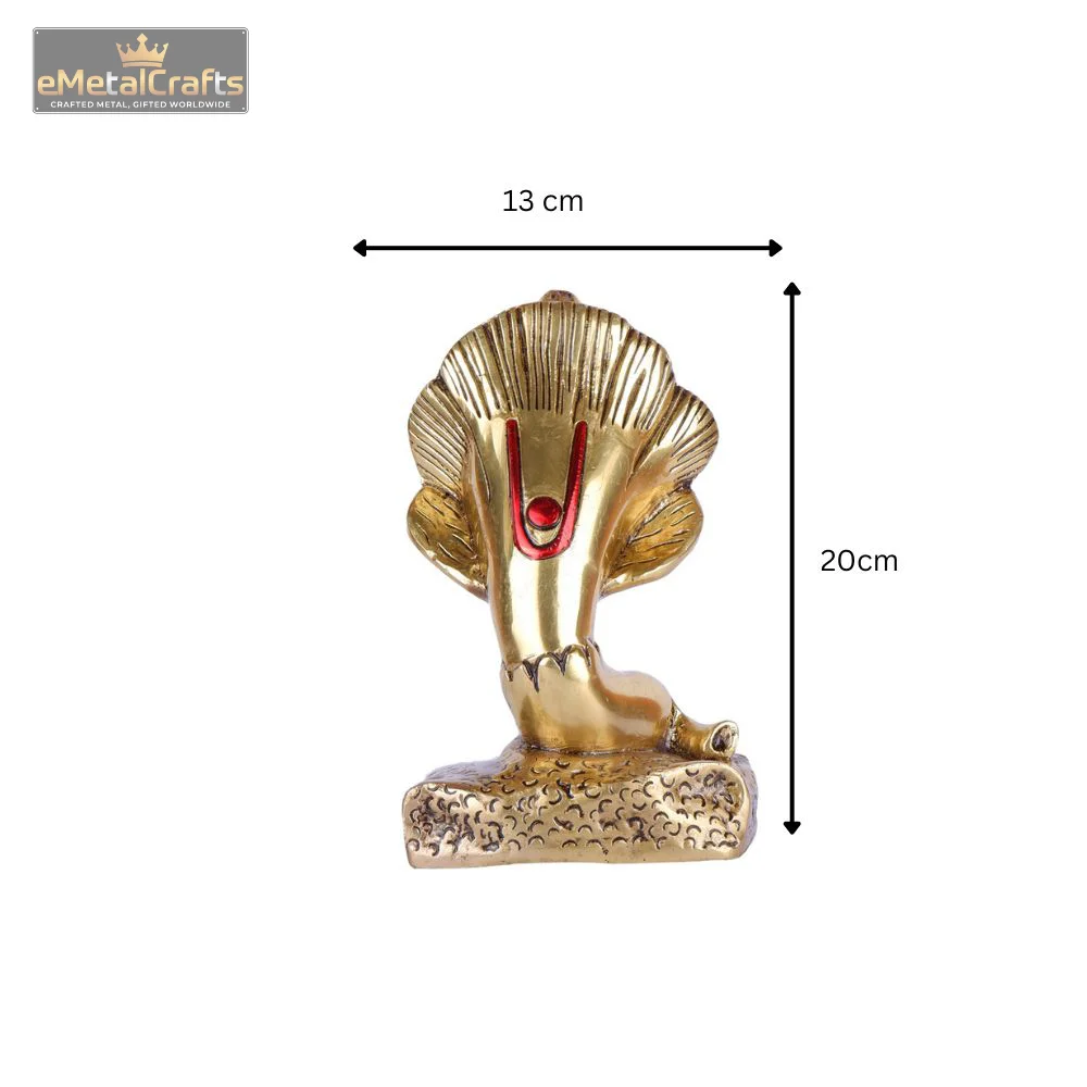 Observe this Brass Ganapati idol, presented in a seated pose. His familiar elephant head, large ears, and curved trunk are accented with carefully applied paint, enhancing his traditional attire in shades of green and reddish-gold. He holds an axe and a small sweet, while his other hands convey blessings. A decorative, flame-like arch rises behind him, complementing his form. The piece rests on a robust base, its surface featuring a classic metallic sheen beneath the applied colors. This representation of the beloved deity makes a meaningful contribution to any household, symbolizing new beginnings and the granting of wishes.